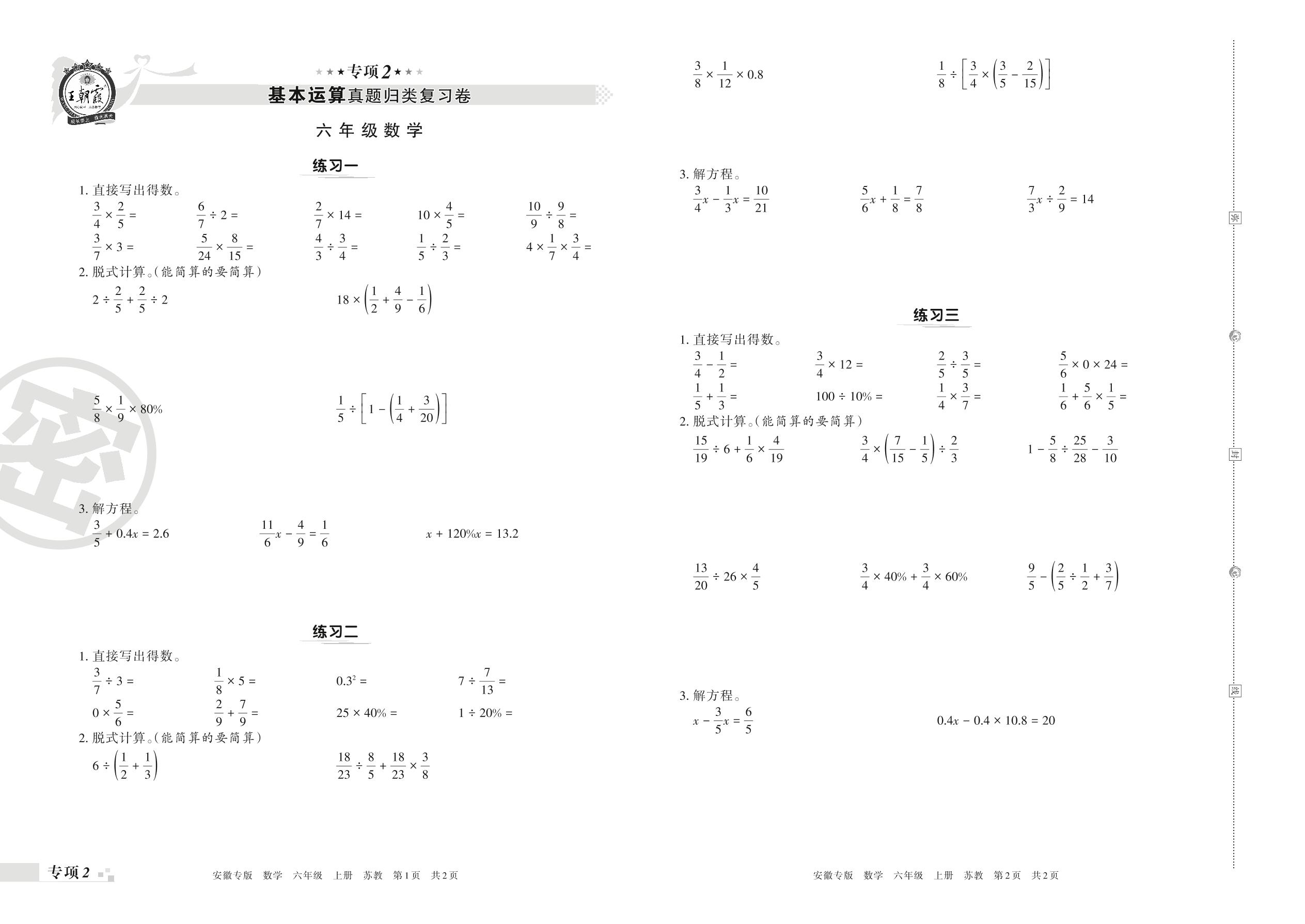 王朝霞期末专项卷——基本运算真题归类复习六年级上册数学(苏教版)【2】