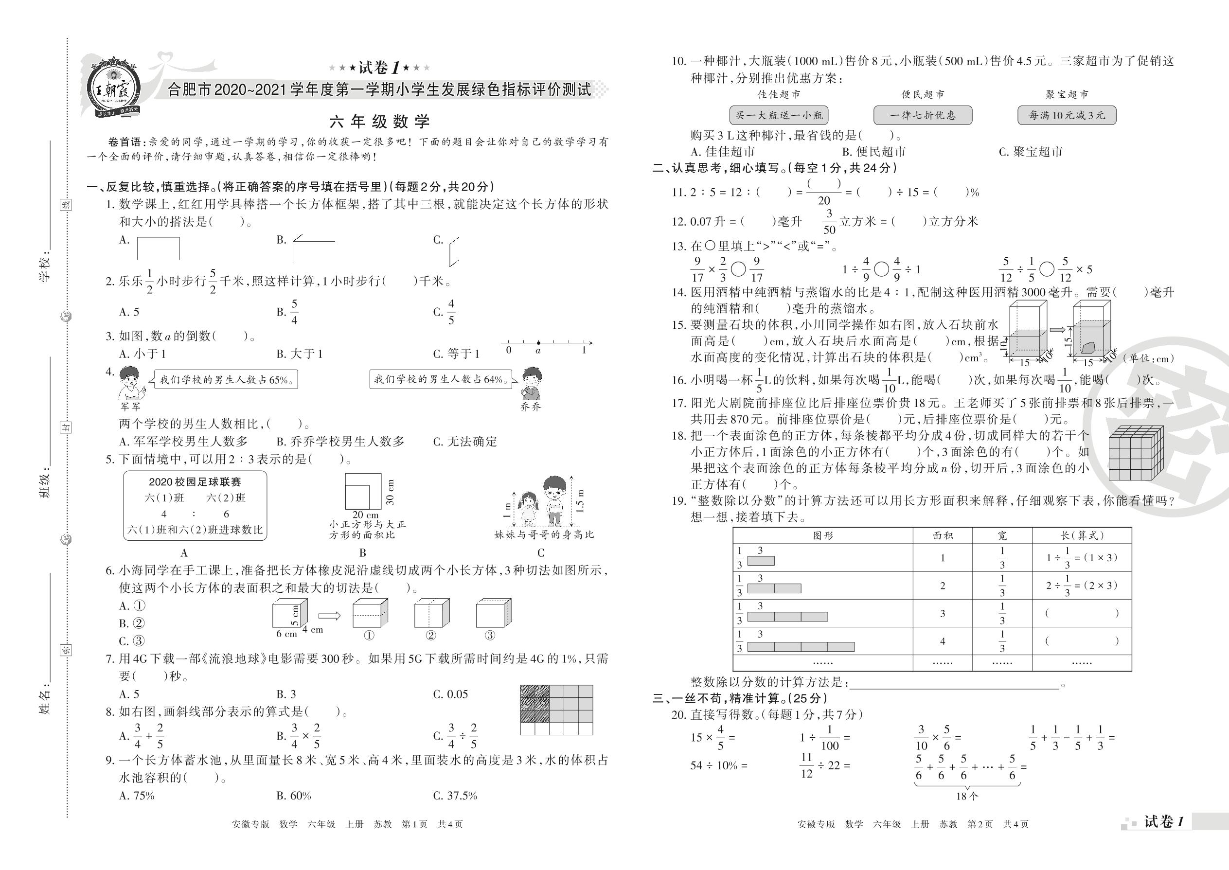合肥市2020~2021学年度第一学期小学生发展绿色指标评价测试六年级数学(苏教版)【1】