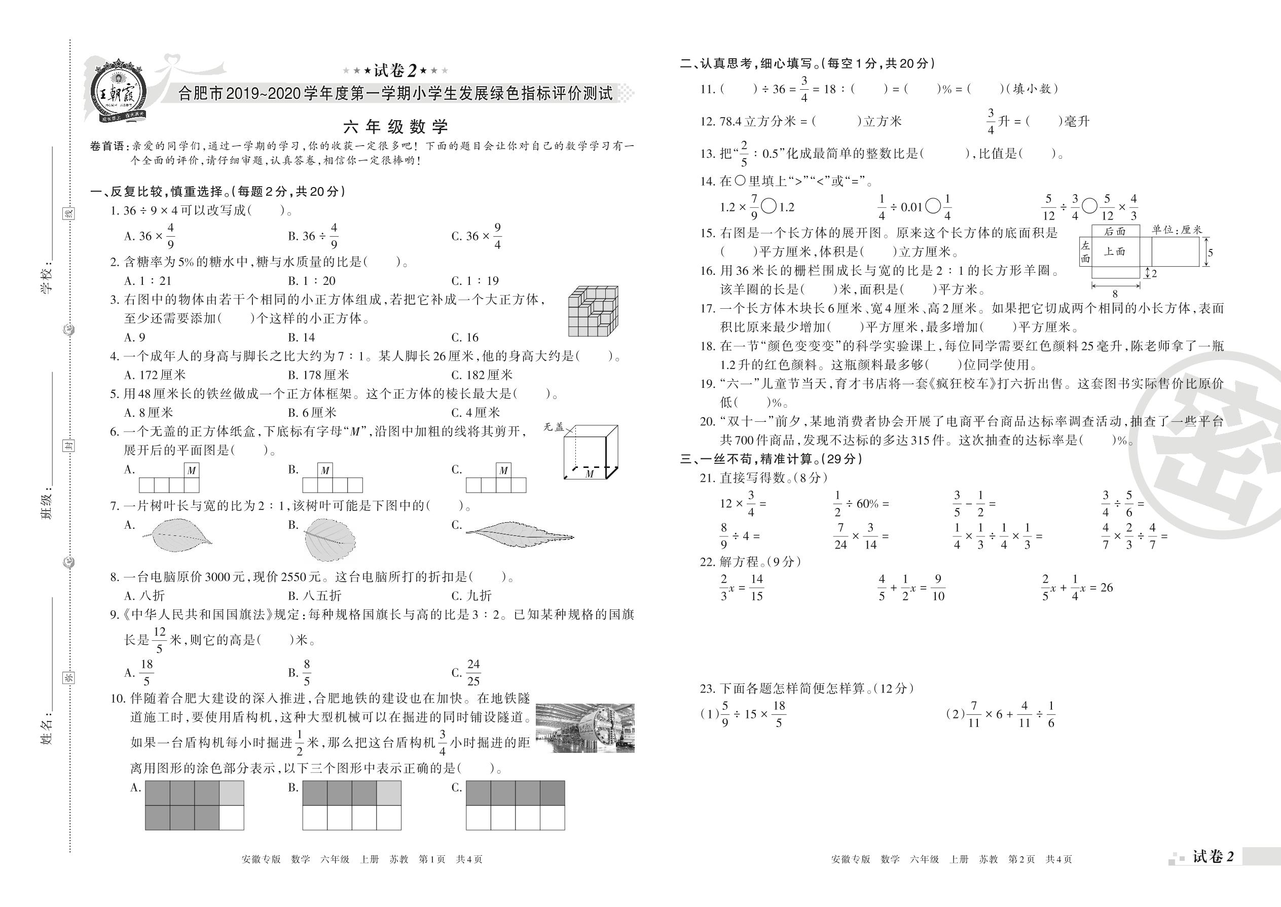 合肥市2019~2020学年度第一学期小学生发展绿色指标评价测试六年级数学(苏教版)【2】