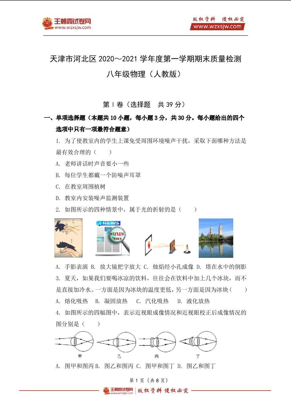 天津市河北区2020~2021学年度第一学期期末八年级物理质量检测(人教版)