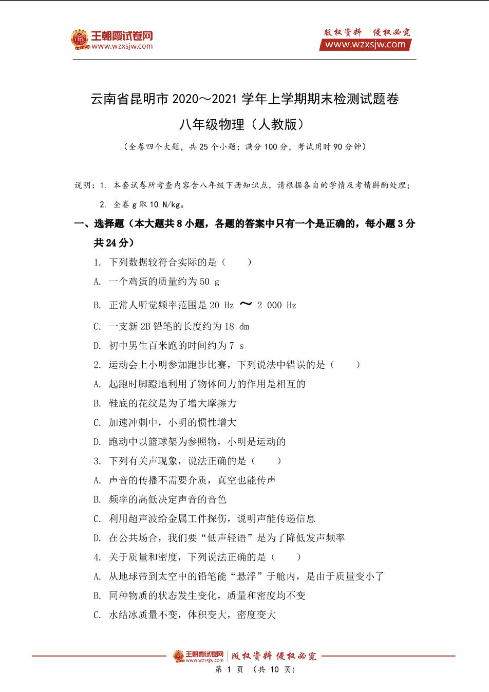 云南省昆明市2020~2021学年上学期期末八年级物理检测试题卷(人教版)
