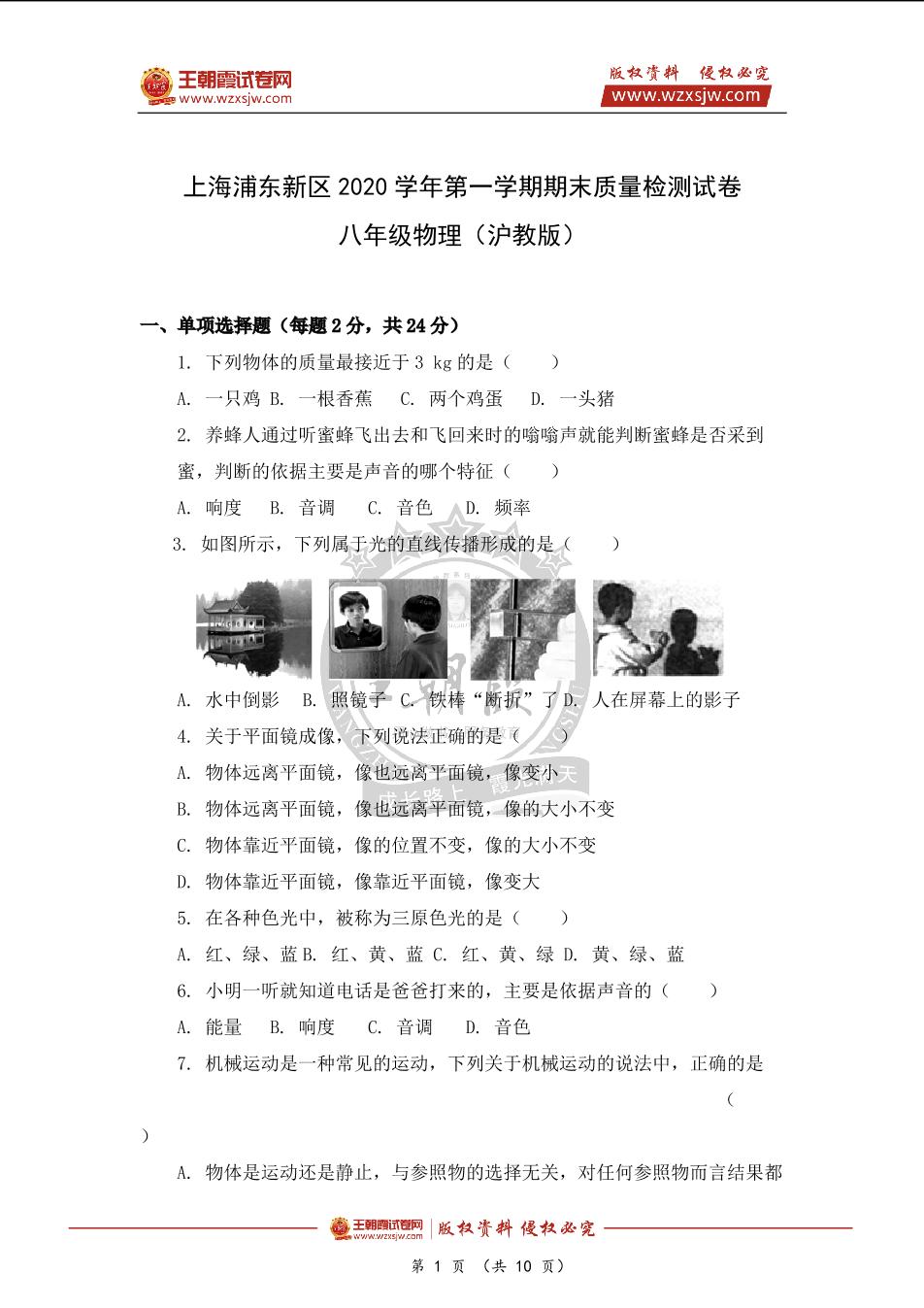 上海浦东新区八物2020学年第一学期期末质量检测试卷八年级物理(沪教版)