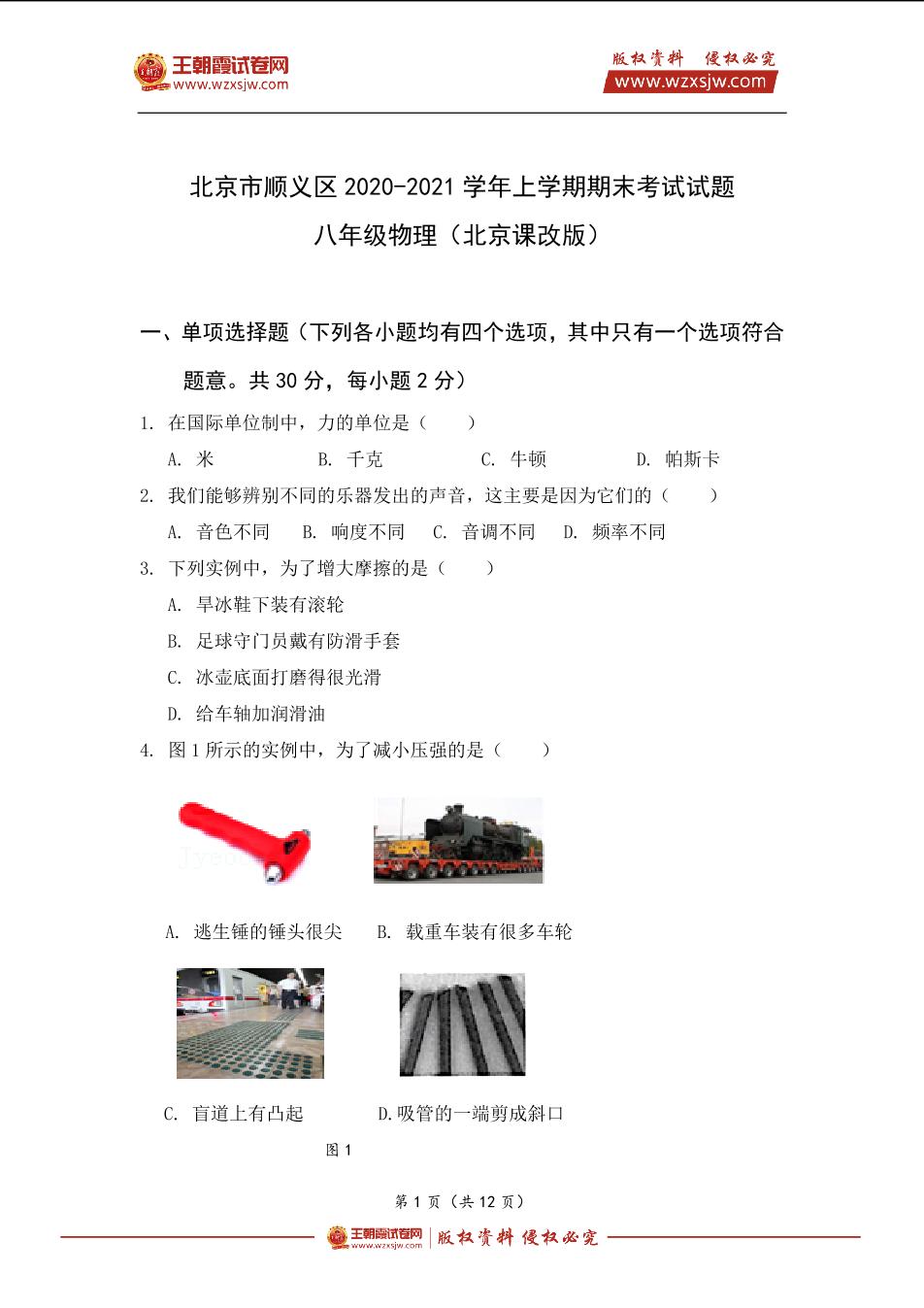 北京市顺义区2020-2021学年上学期期末考试试题八年级物理(北京市课改版)