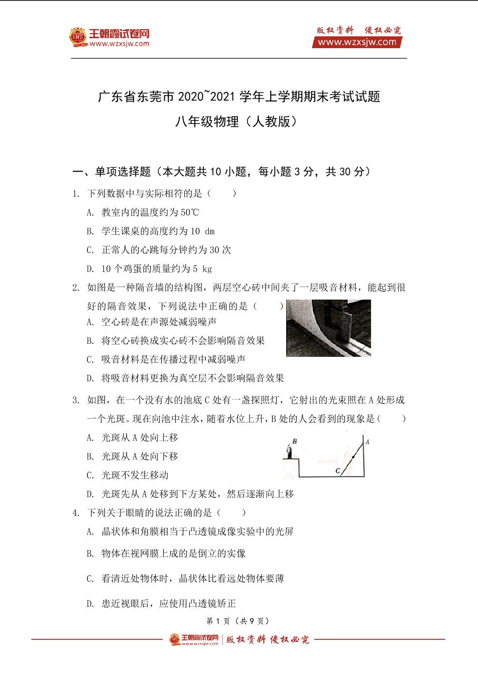 广东省东莞市2020-2021学年八年级上学期期末考试物理试题(人教版)正文.pdf
