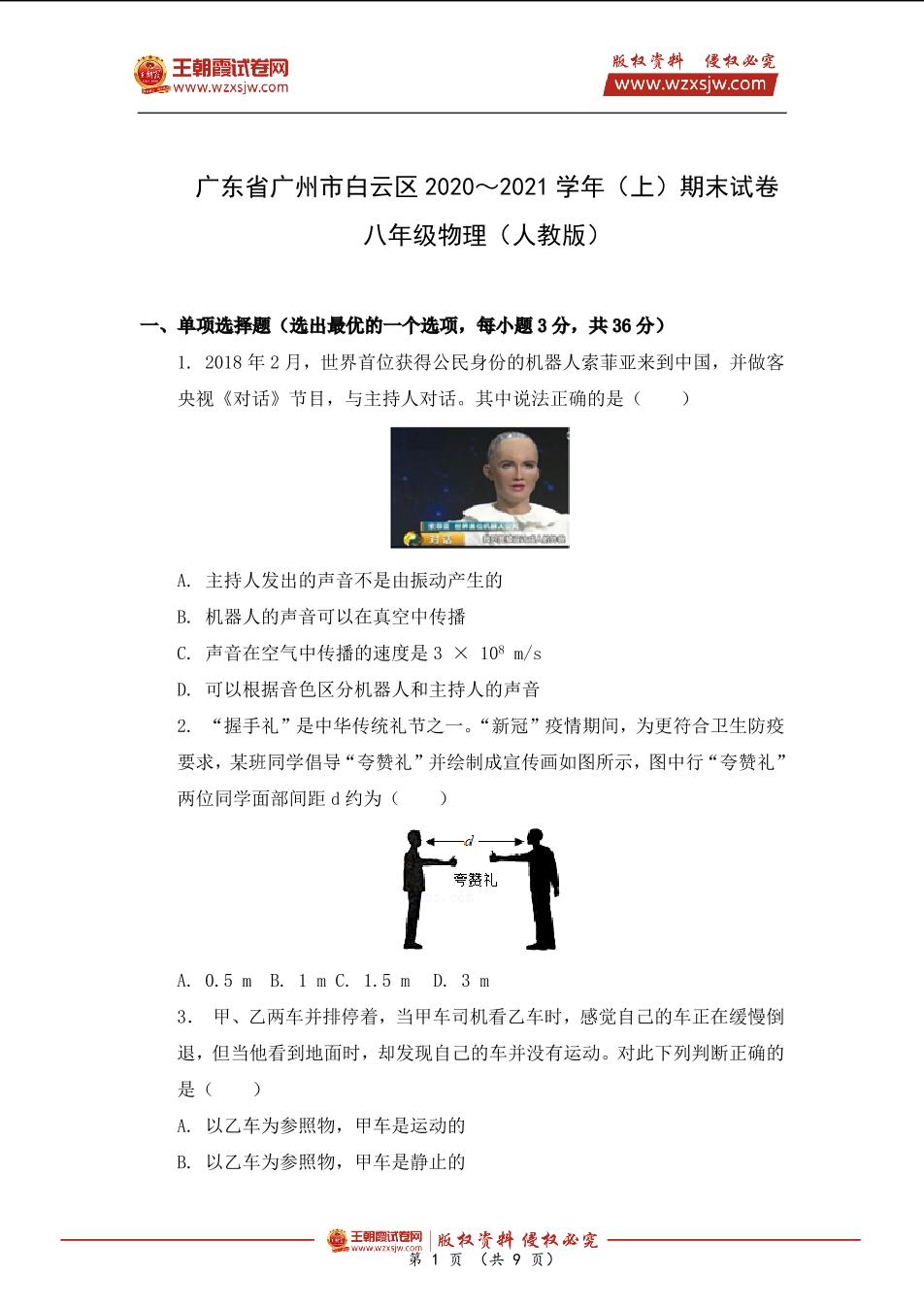 广东省广州市白云区2020~2021学年(上)期末八年级物理试卷(人教版)