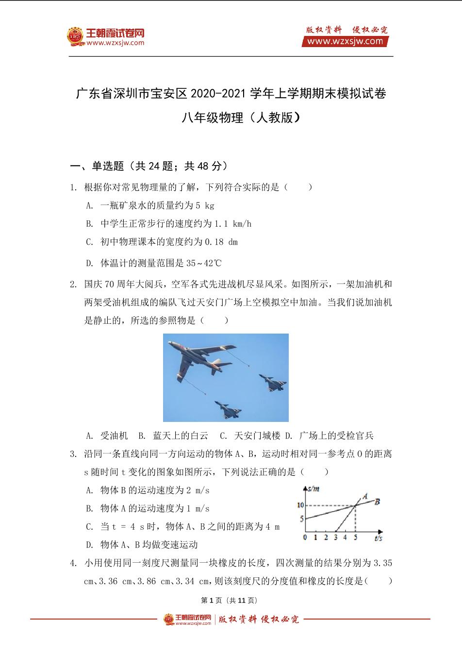 广东省深圳市宝安区2020-2021学年上学期期末模拟试卷八年级物理(人教版)