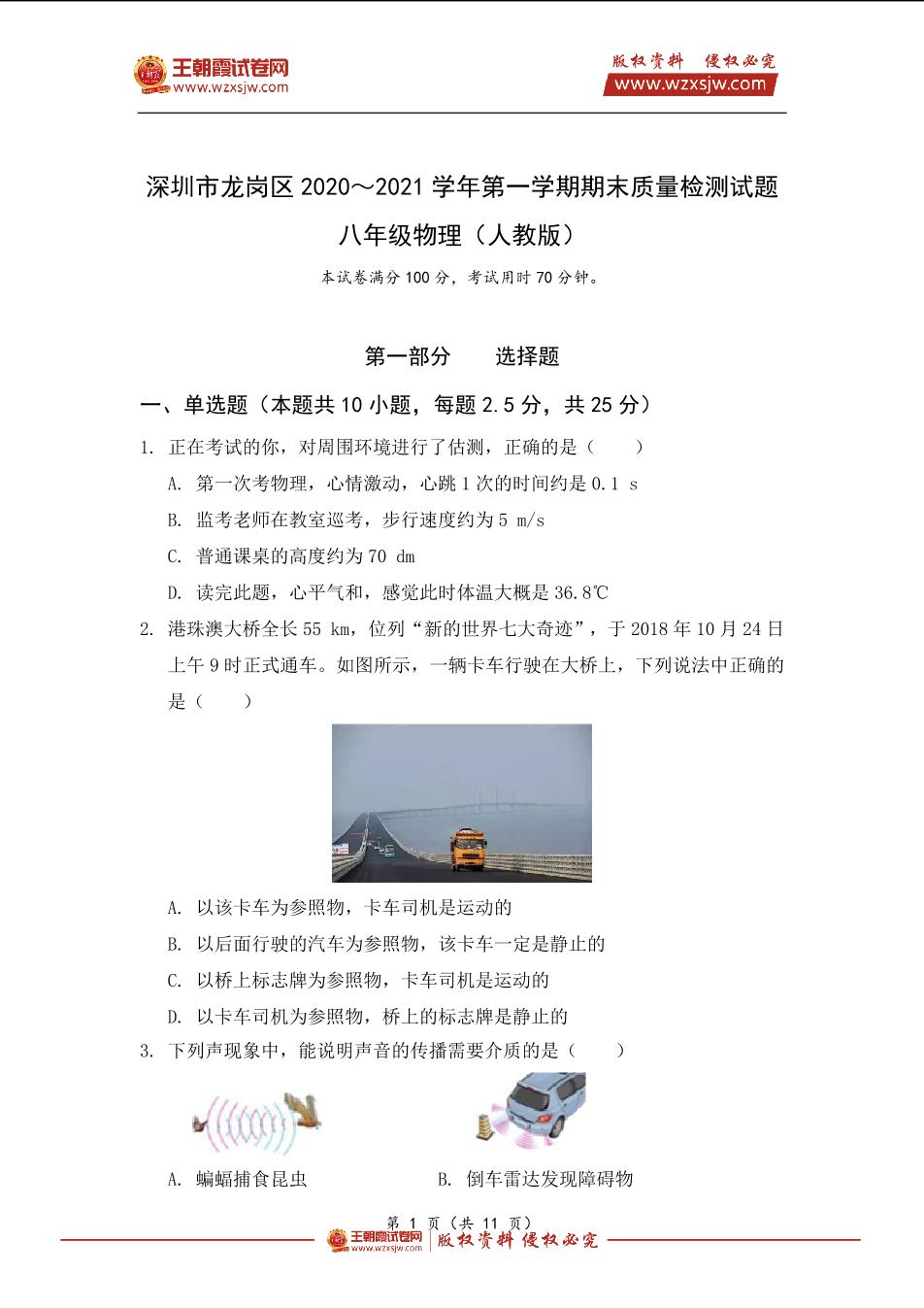 深圳市龙岗区2020~2021学年第一学期期末八年级物理质量检测试题(人教版)