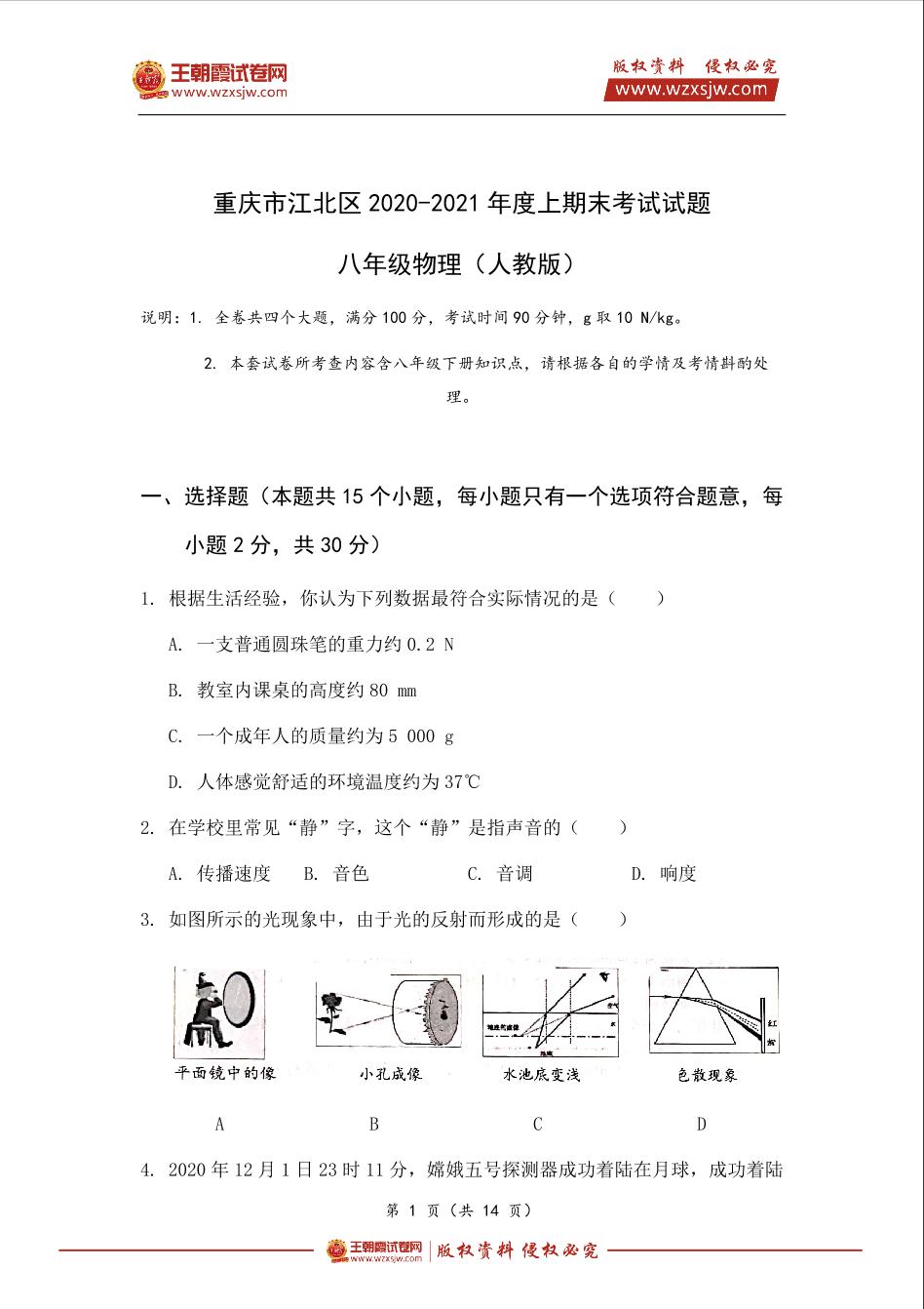 重庆市江北区2020-2021年度上学期期末考试试题八年级物理(人教版)