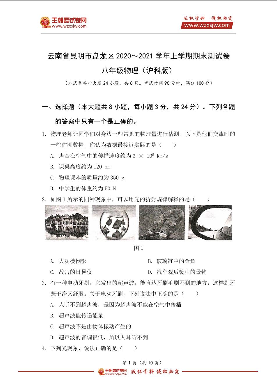 云南省昆明市盘龙区2020~2021学年上学期期末测试卷八年级物理(沪科版)