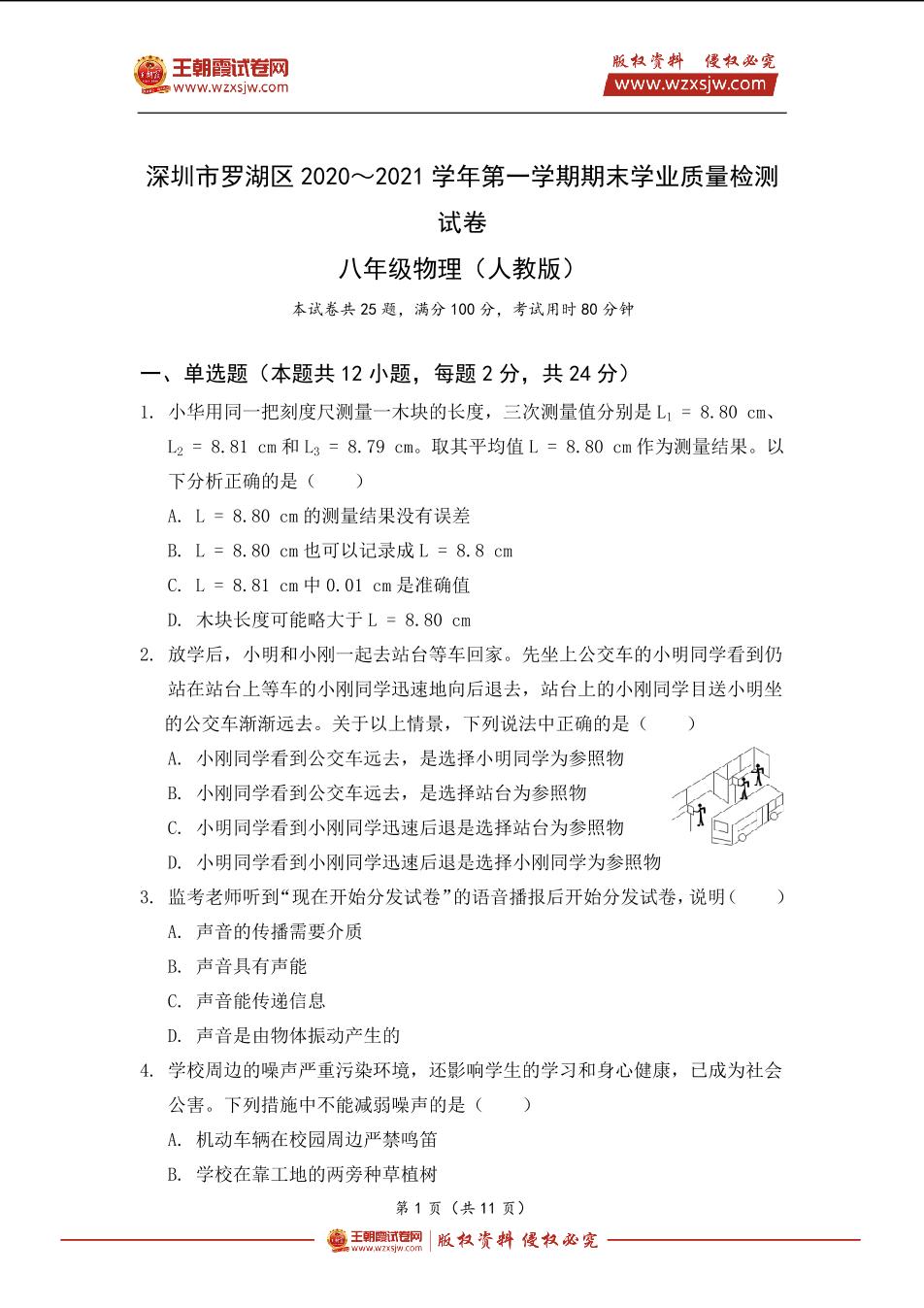 深圳市罗湖区2020~2021学年度第一学期期末检测试卷八年级物理(人教版)