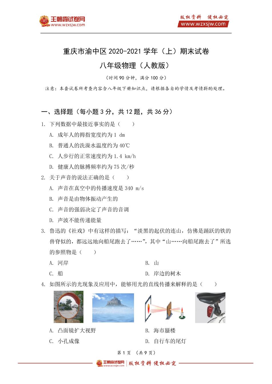 重庆市渝中区2020-2021学年(上)期末八年级物理试卷(人教版)