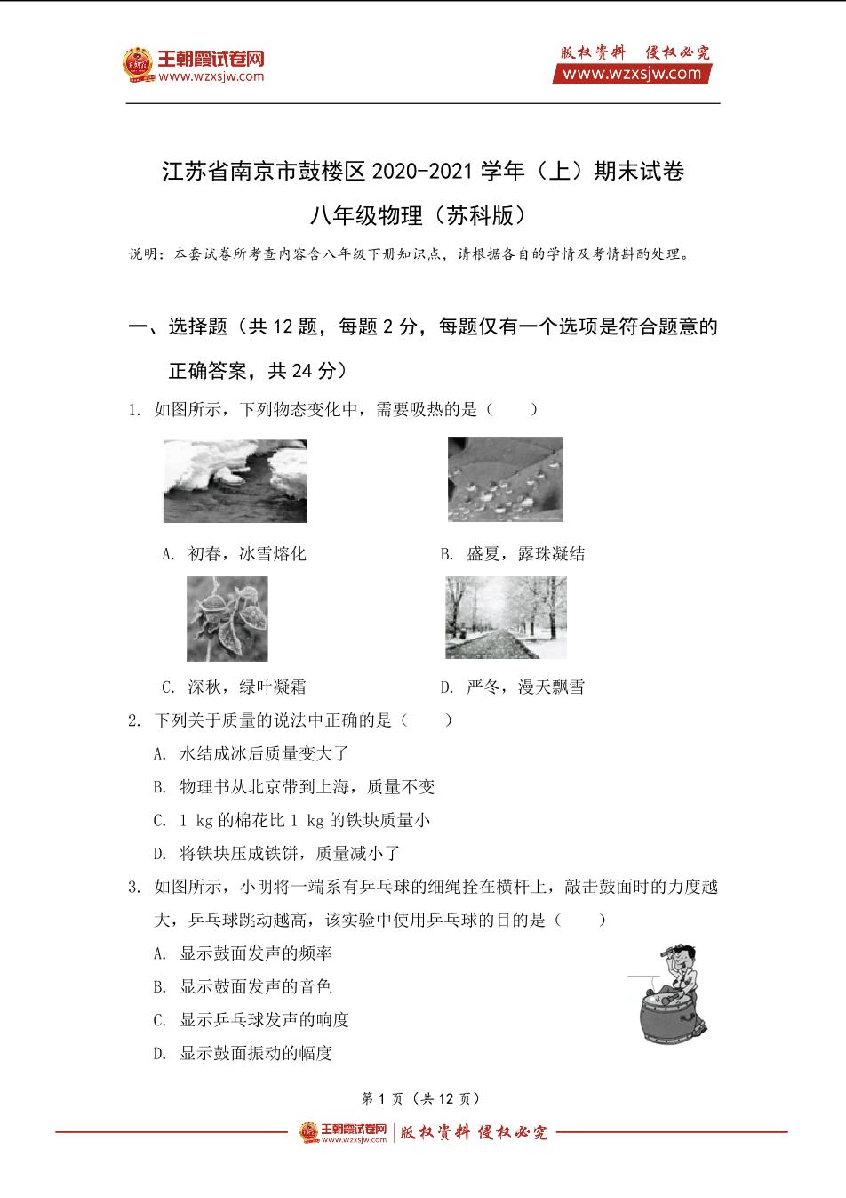 江苏省南京市鼓楼区2020-2021学年(上)期末试卷八年级物理(苏科版)