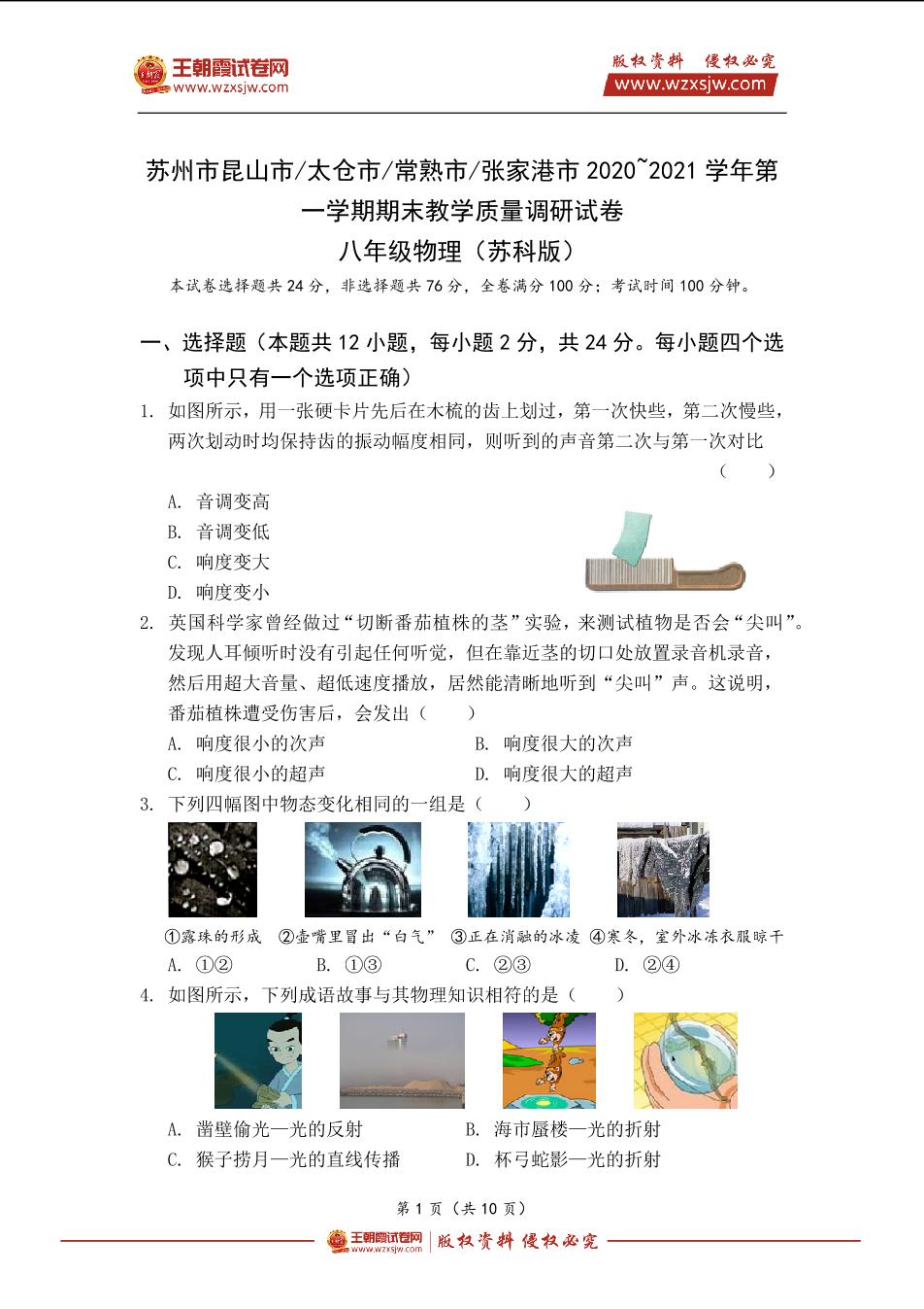 苏州市昆山市太仓市常熟市张家港市2020~2021学年第一学期期末教学质量调研试卷八年级物理(苏科版)