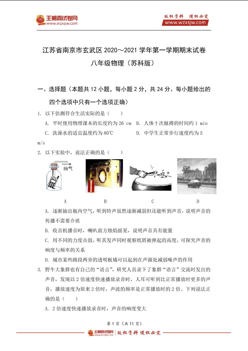 江苏省南京市玄武区2020~2021学年第一学期期末八年级物理试卷(苏科版)