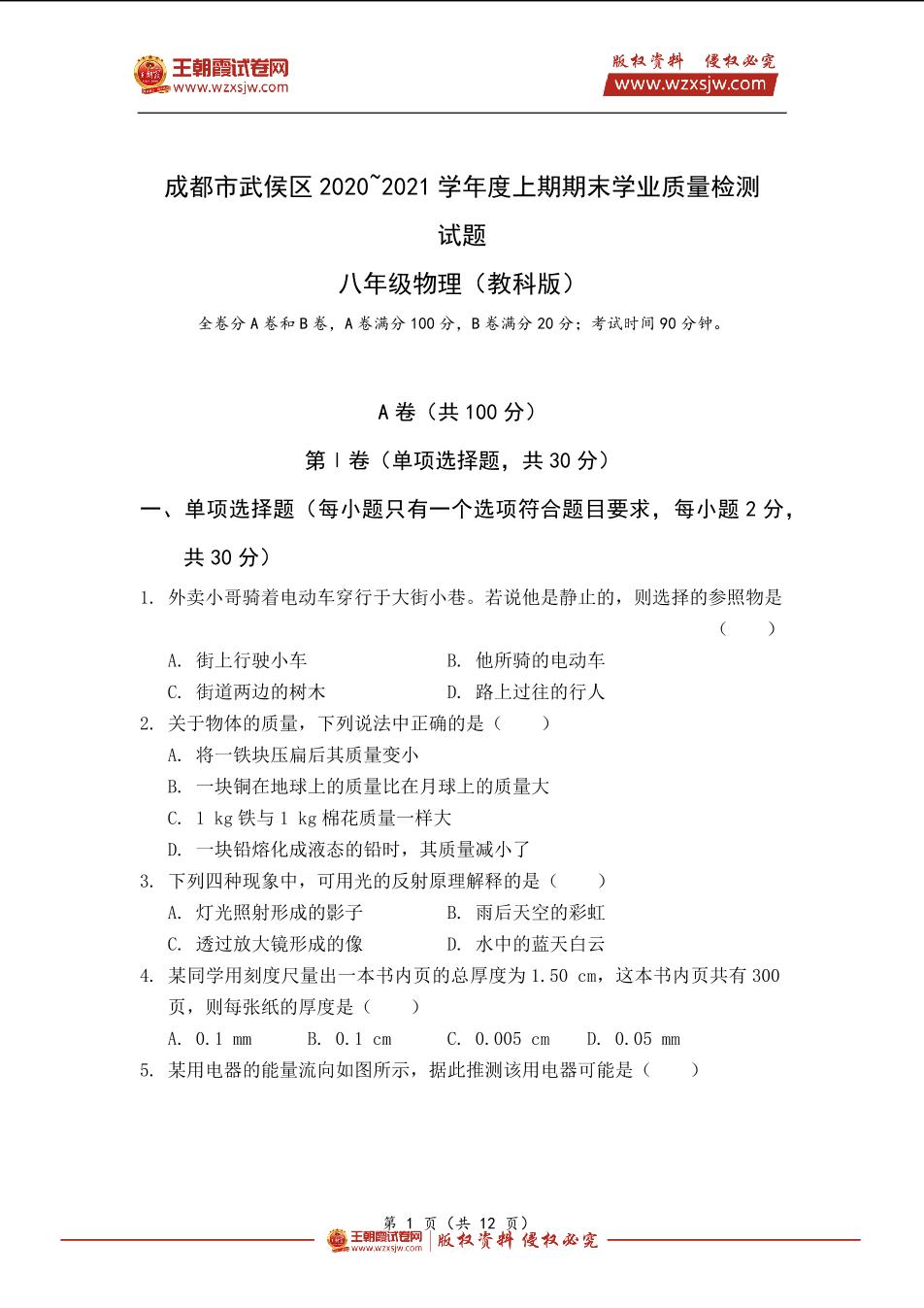 成都市武侯区2020~2021学年度上期期末学业质量检测试题八年级物理(教科版)