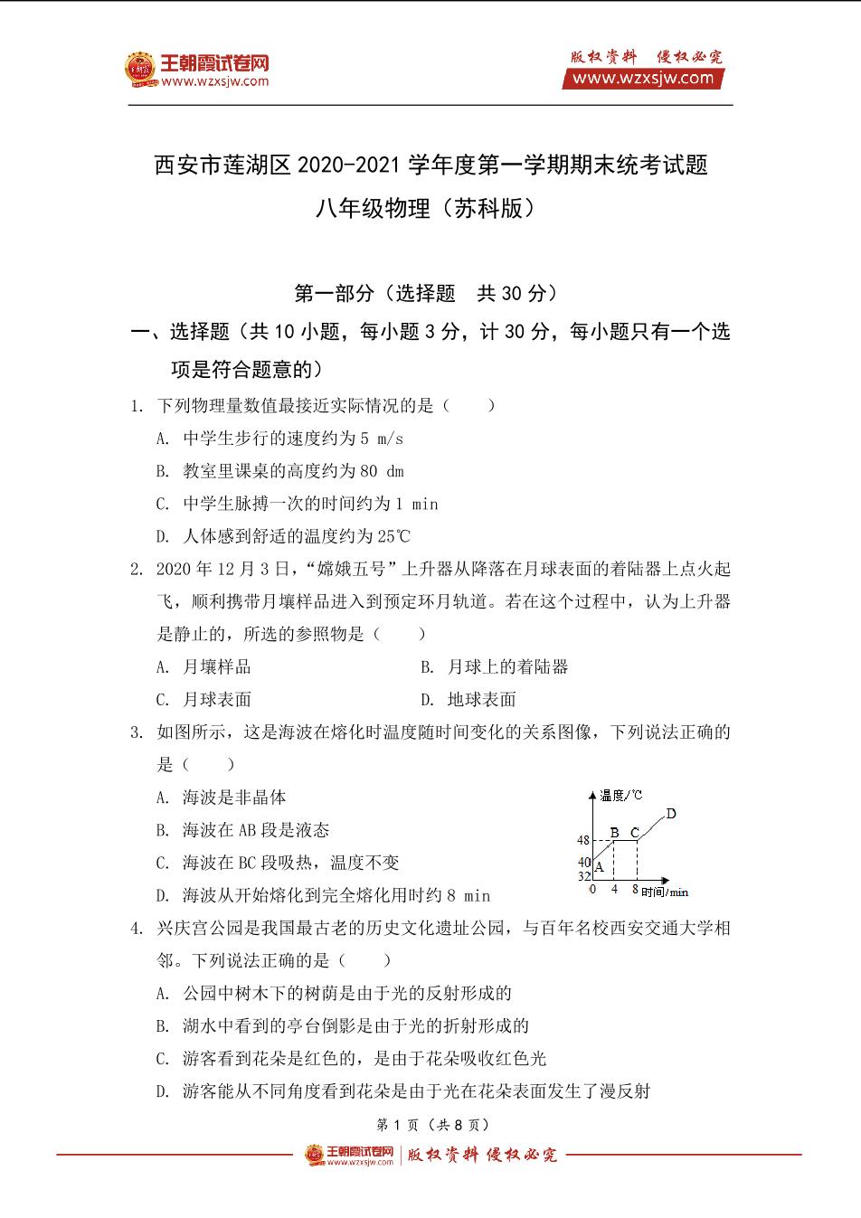 西安市莲湖区2020-2021学年度第一学期期末八年级物理统考试题八年级物理(苏科版)