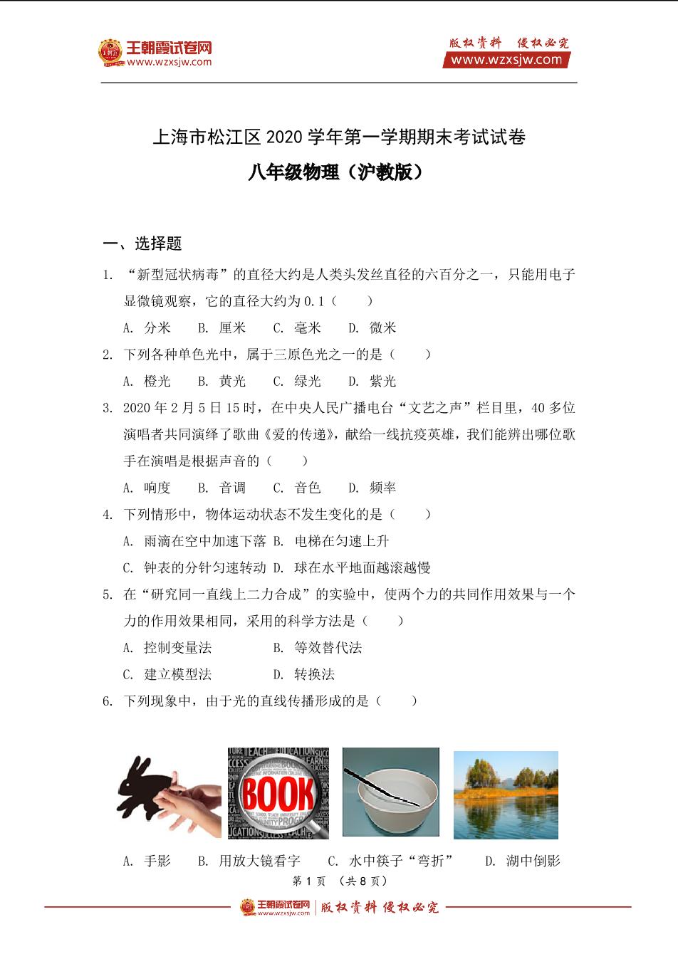 上海市松江区2020学年第一学期期末考试八年级物理试卷(沪教版)