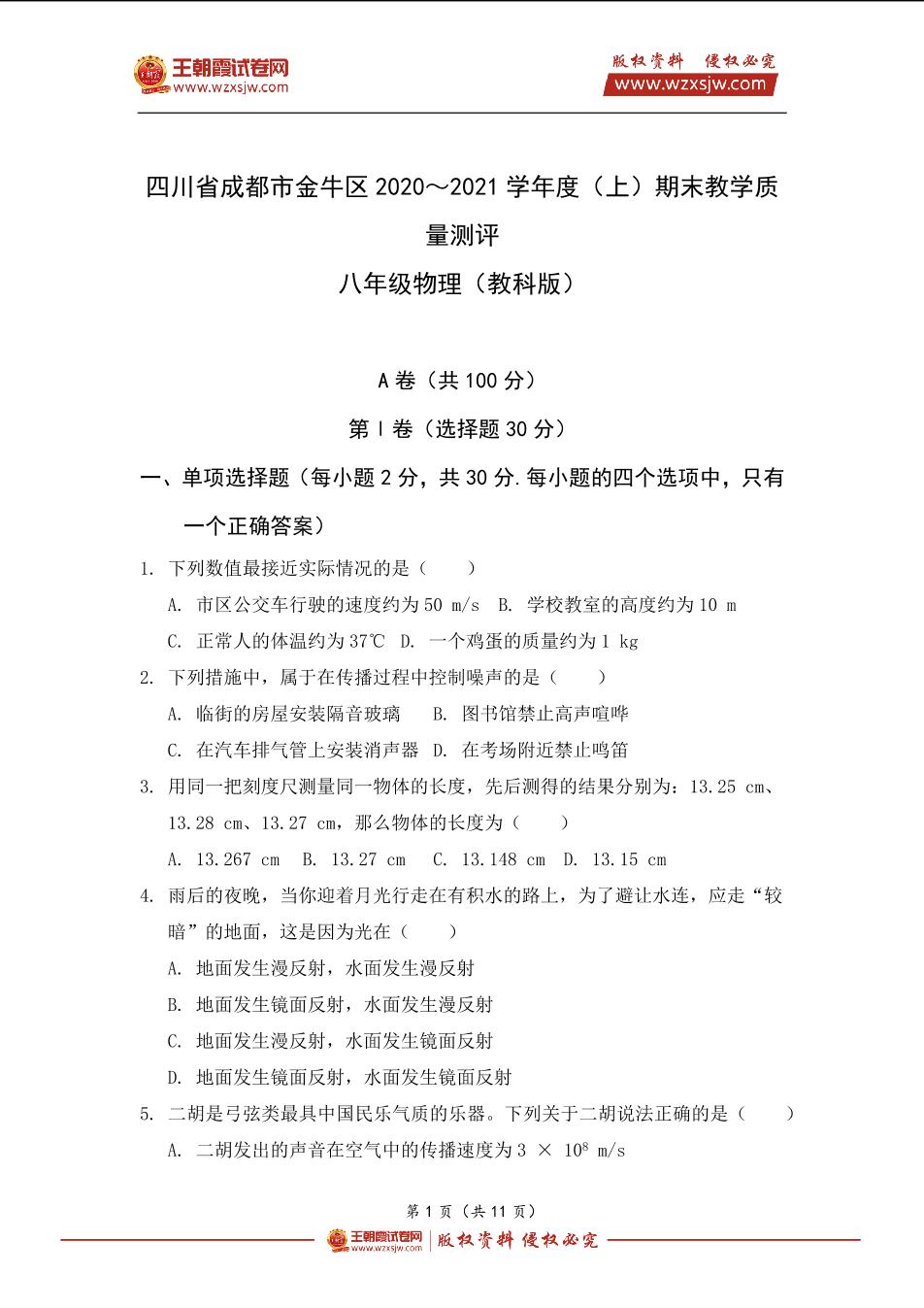 四川省成都市金牛区2020~2021学年度(上)期末教学质量测评八年级物理(教科版)