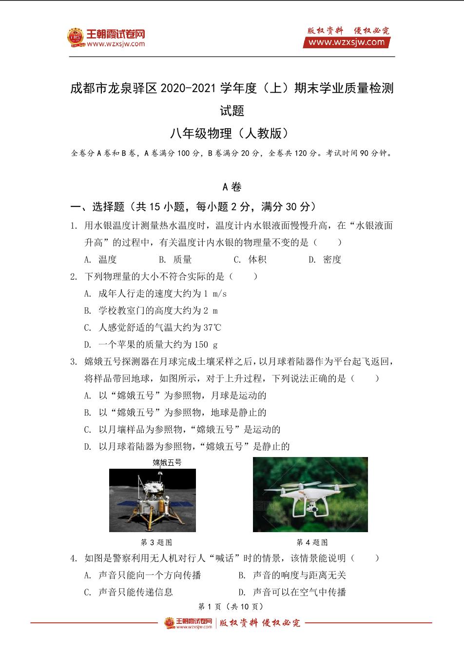 成都市龙泉驿区2020-2021学年度(上)期末学业质量检测试题八年级物理(人教版)
