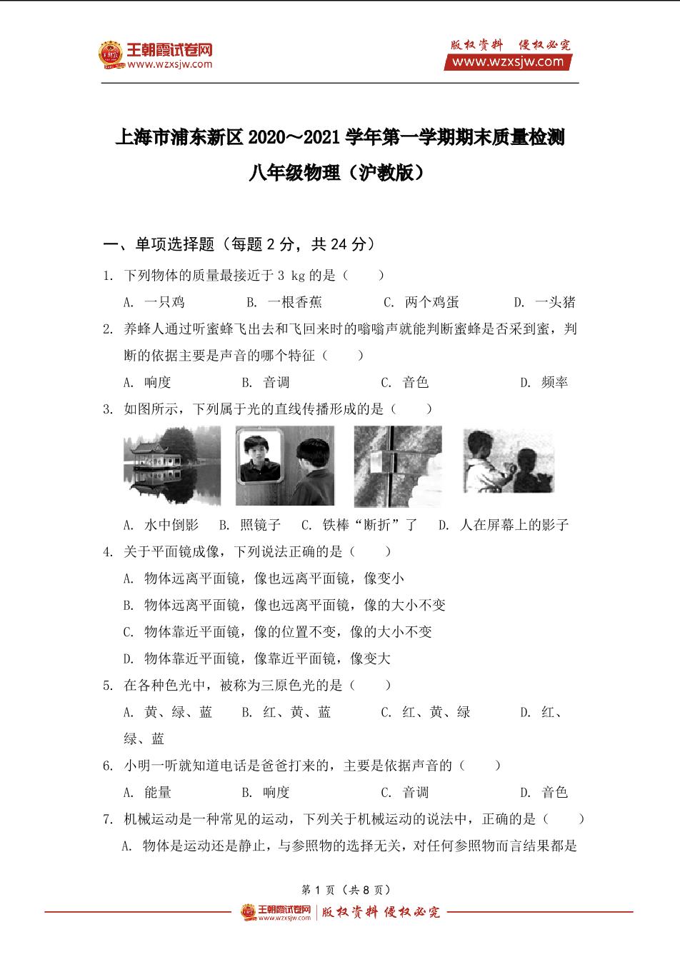上海市浦东新区2020~2021学年第一学期期末质量检测八年级物理(沪教版)