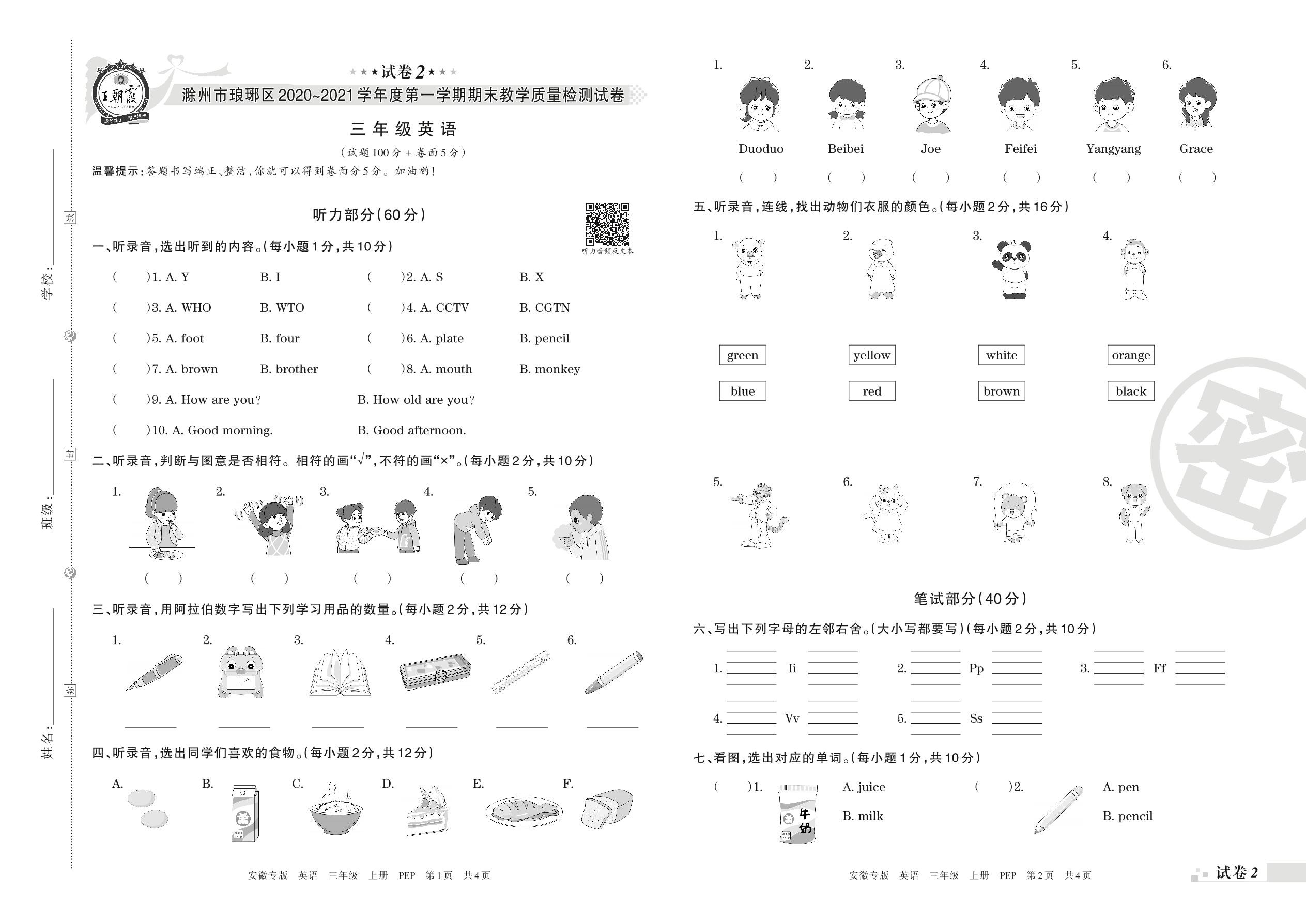 滁州市琅琊区2020~2021学年度第一学期期末教学质量检测试卷三年级英语(人教PEP版)【2】