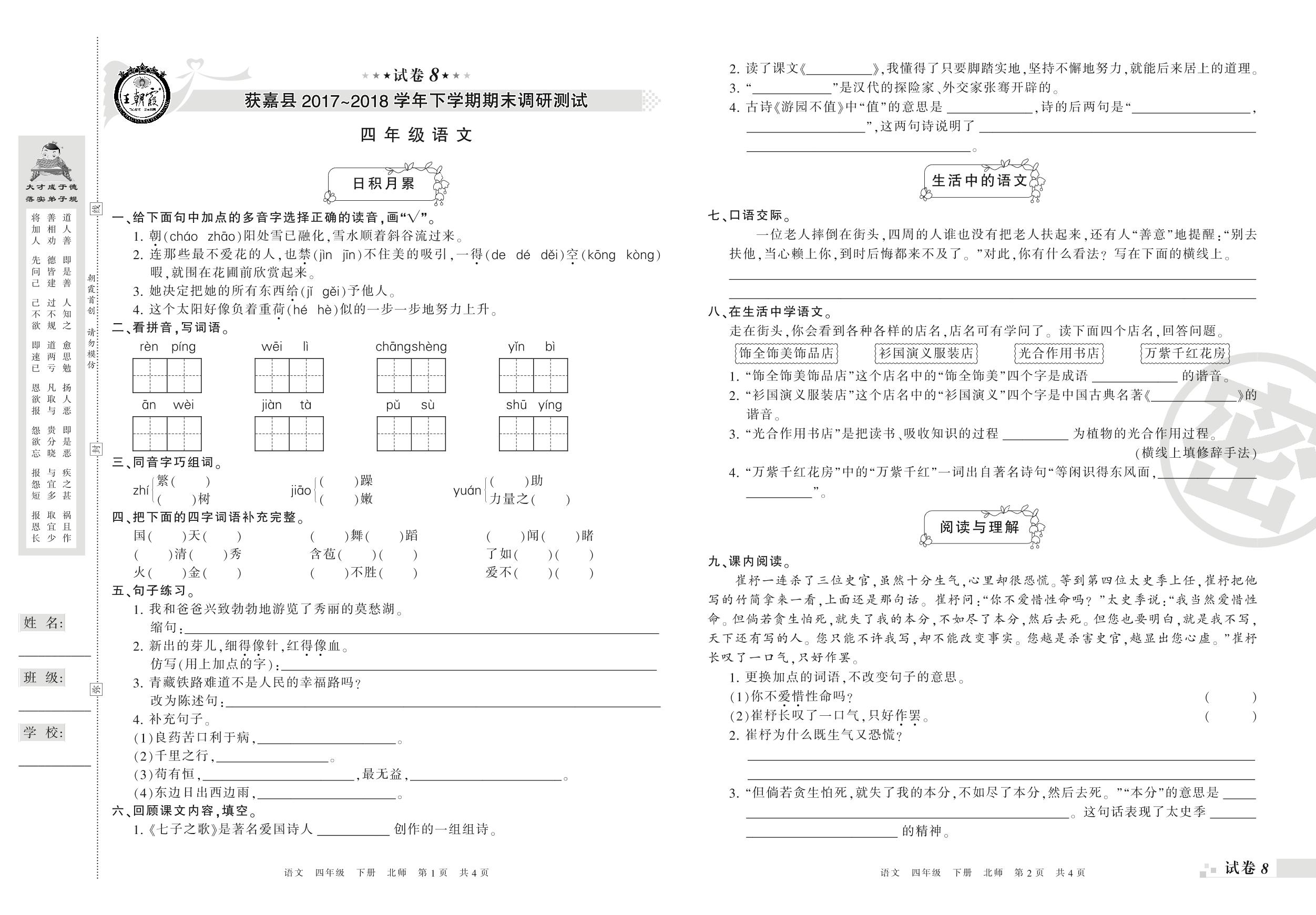2017-2018学年第二学期新乡市获嘉县四年级语文试卷(北师版)【8】