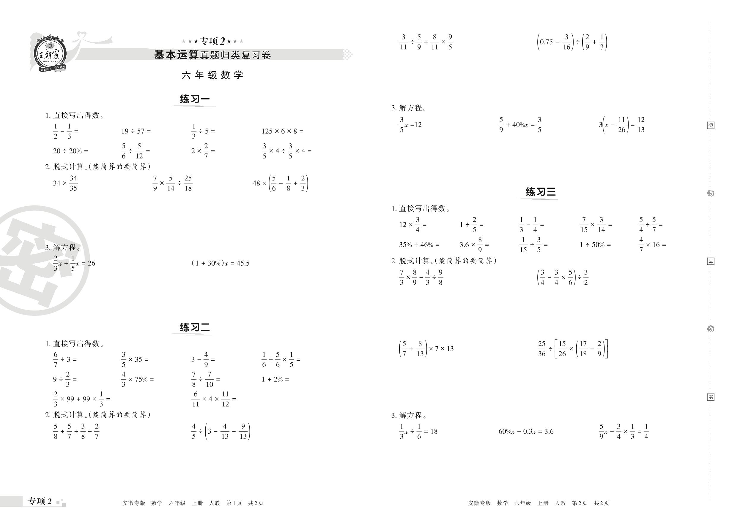 王朝霞期末专项卷——基本运算真题归类复习六年级上册数学(人教版)【2】