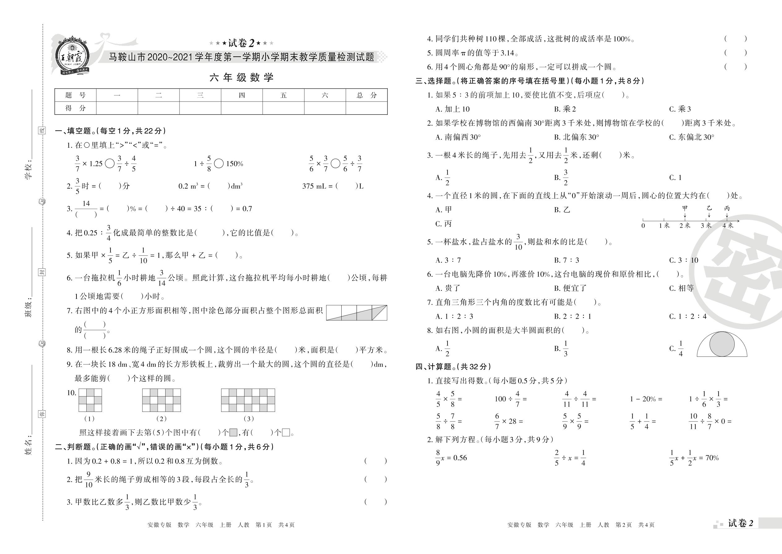 马鞍山市2020~2021学年度第一学期小学期末教学质量检测试题六年级数学(人教版)【2】