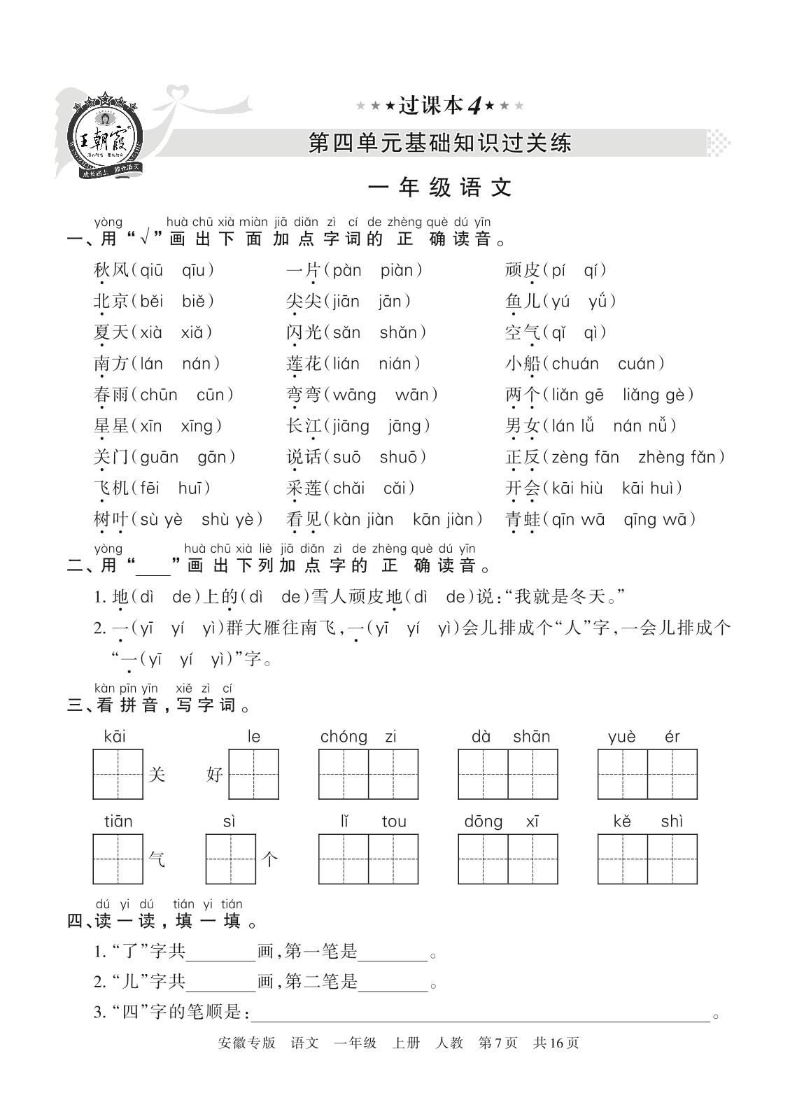 王朝霞期末过课本——第四单元基础知识过关练一年级上册语文(人教版)_R211112103147711【4】