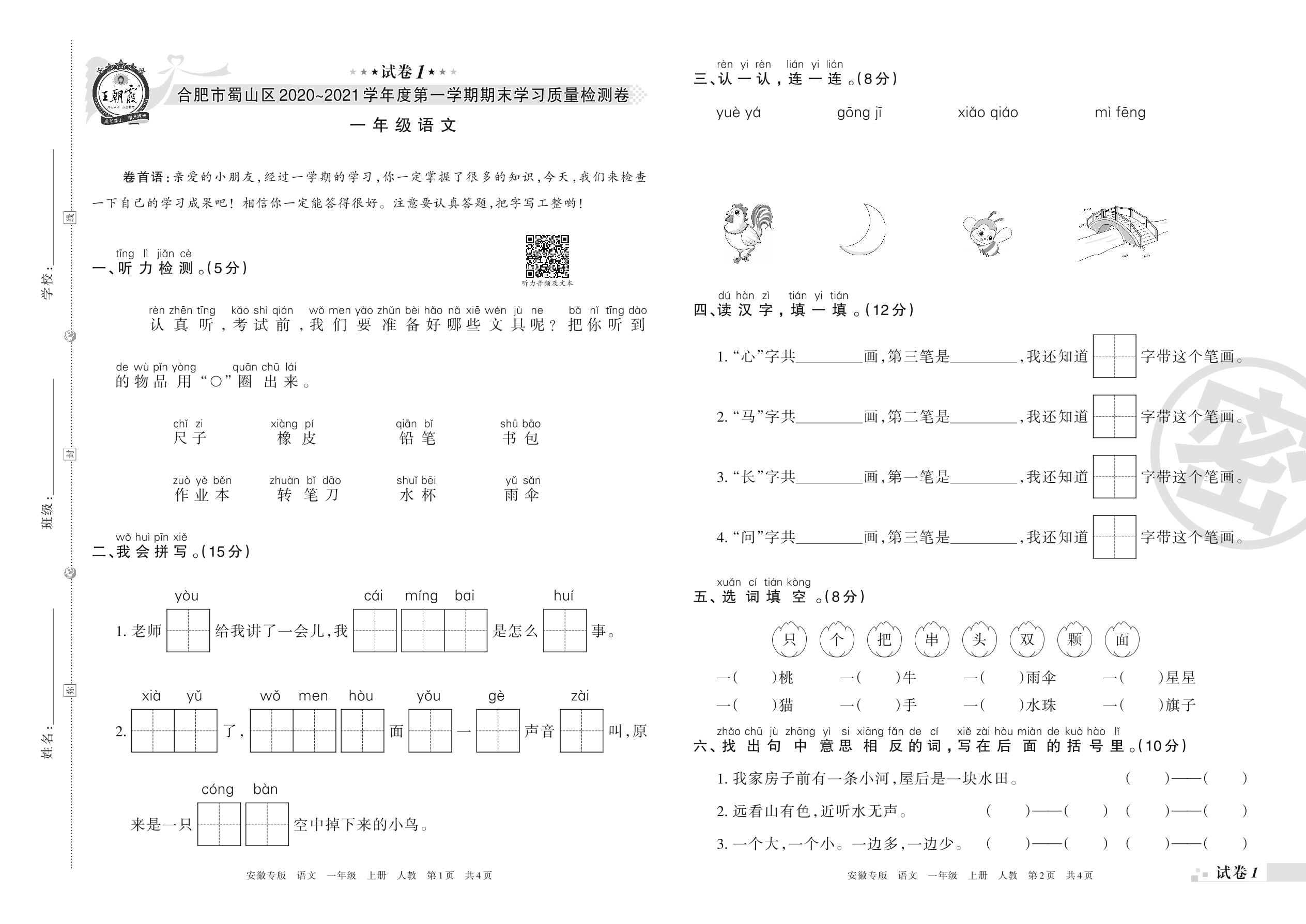 合肥市蜀山区2020~2021学年度第一学期期末学习质量检测卷一年级语文(人教版)【1】