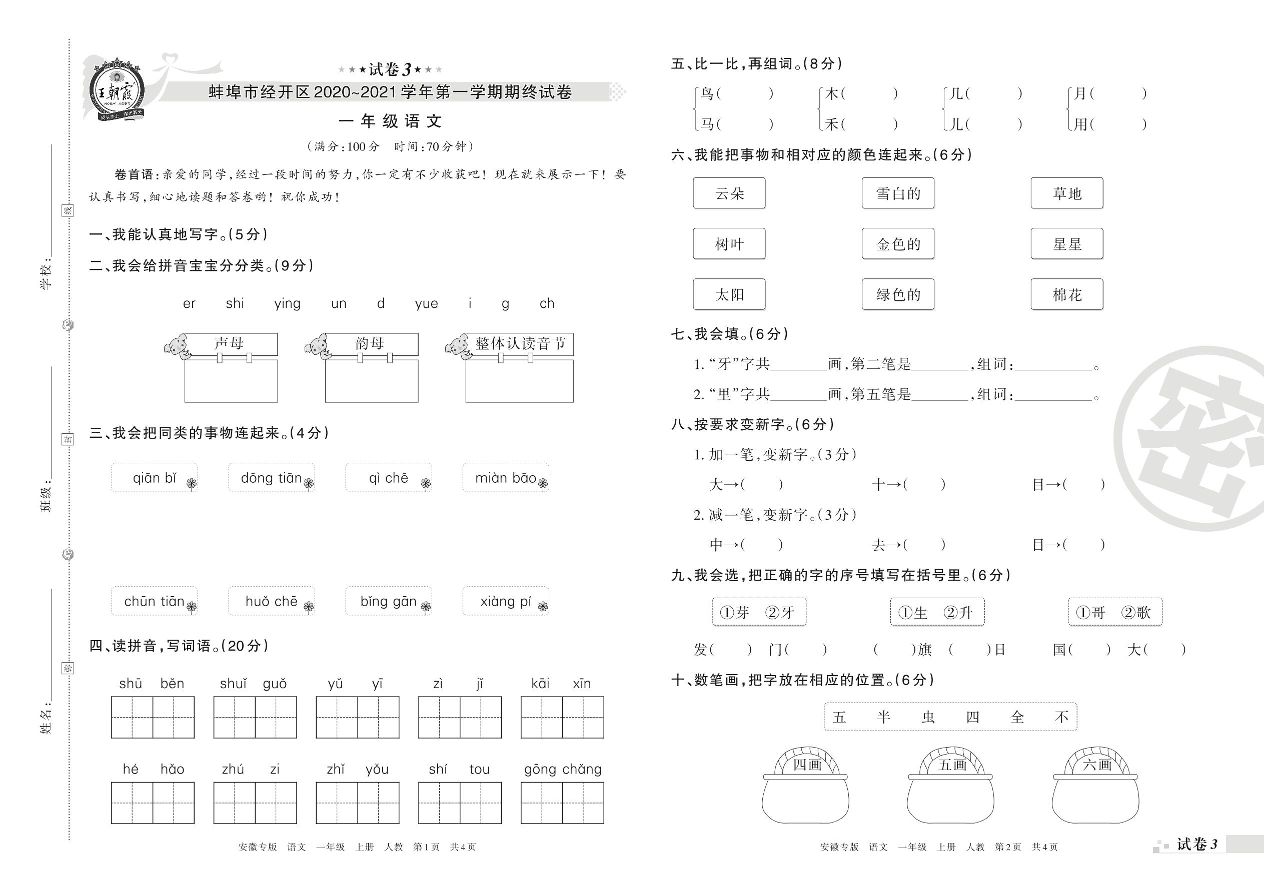 蚌埠市经开区2020~2021学年第一学期期终试卷一年级语文(人教版)【3】
