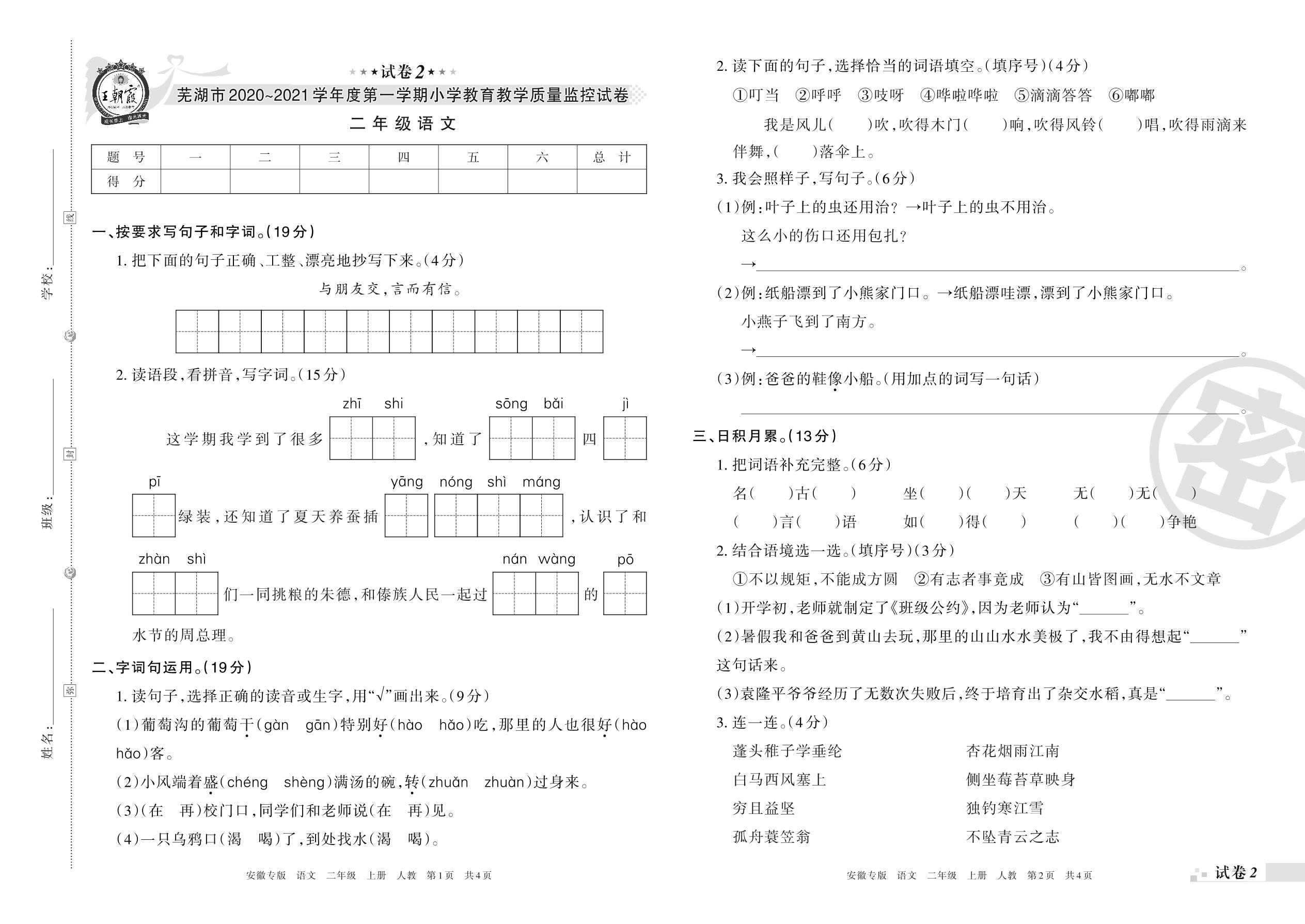 芜湖市2020~2021学年度第一学期小学教育教学质量监控试卷二年级语文(人教版)【2】