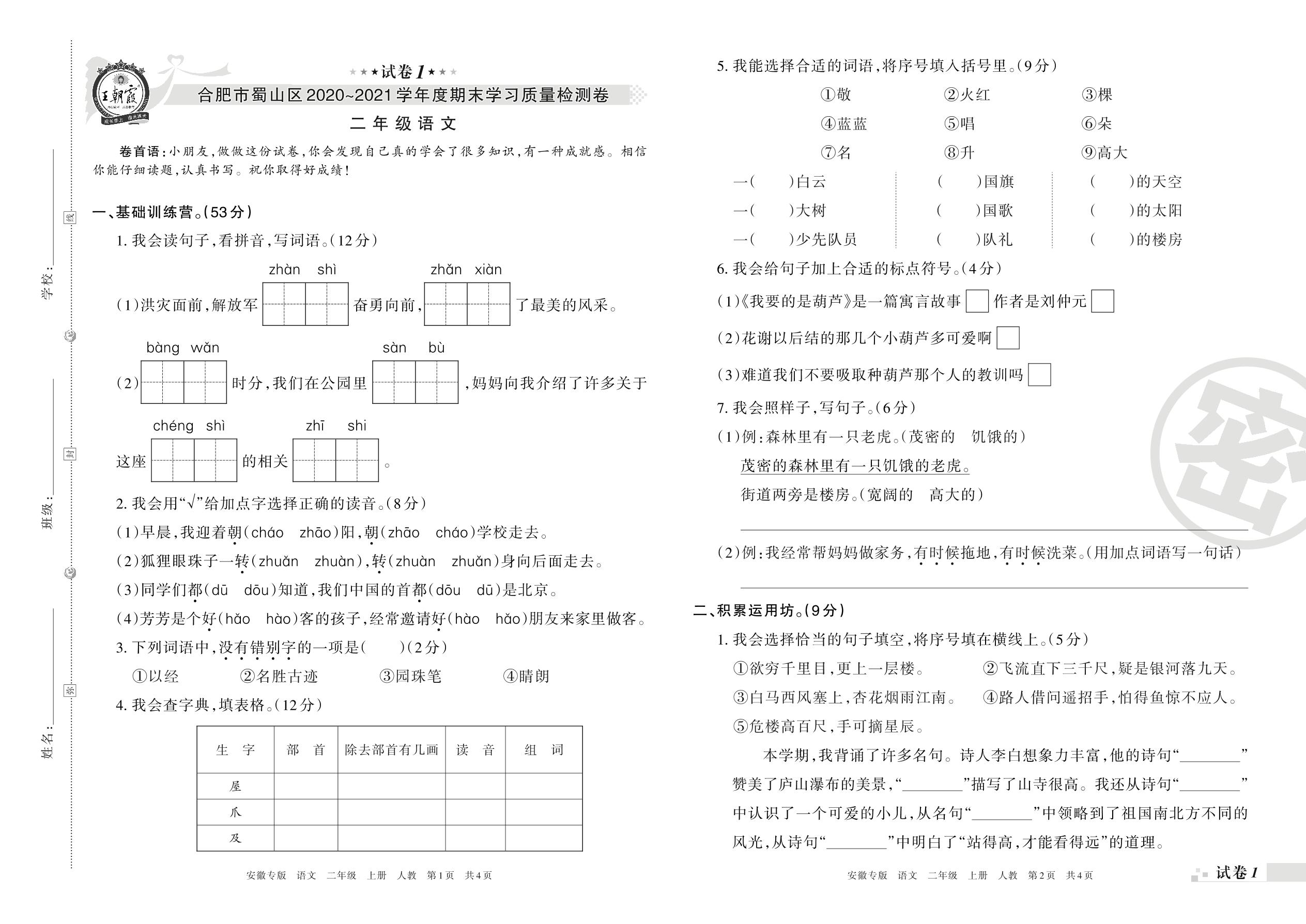 合肥市蜀山区2020~2021学年度期末学习质量检测卷二年级语文(人教版)【1】