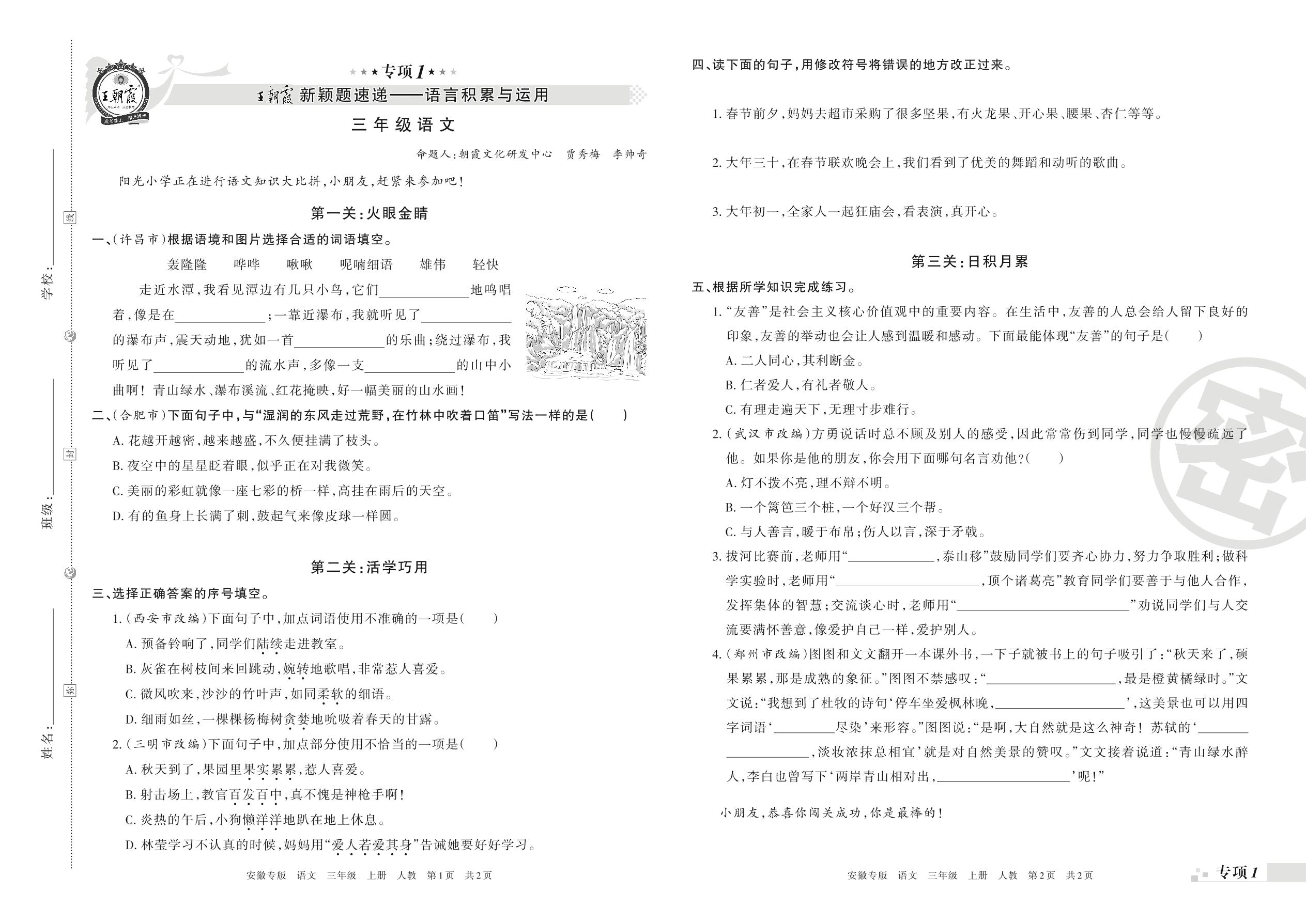 王朝霞期末专项卷——新颖题速递:语言积累与运用三年级上册语文(人教版)_R211112105046667【1】