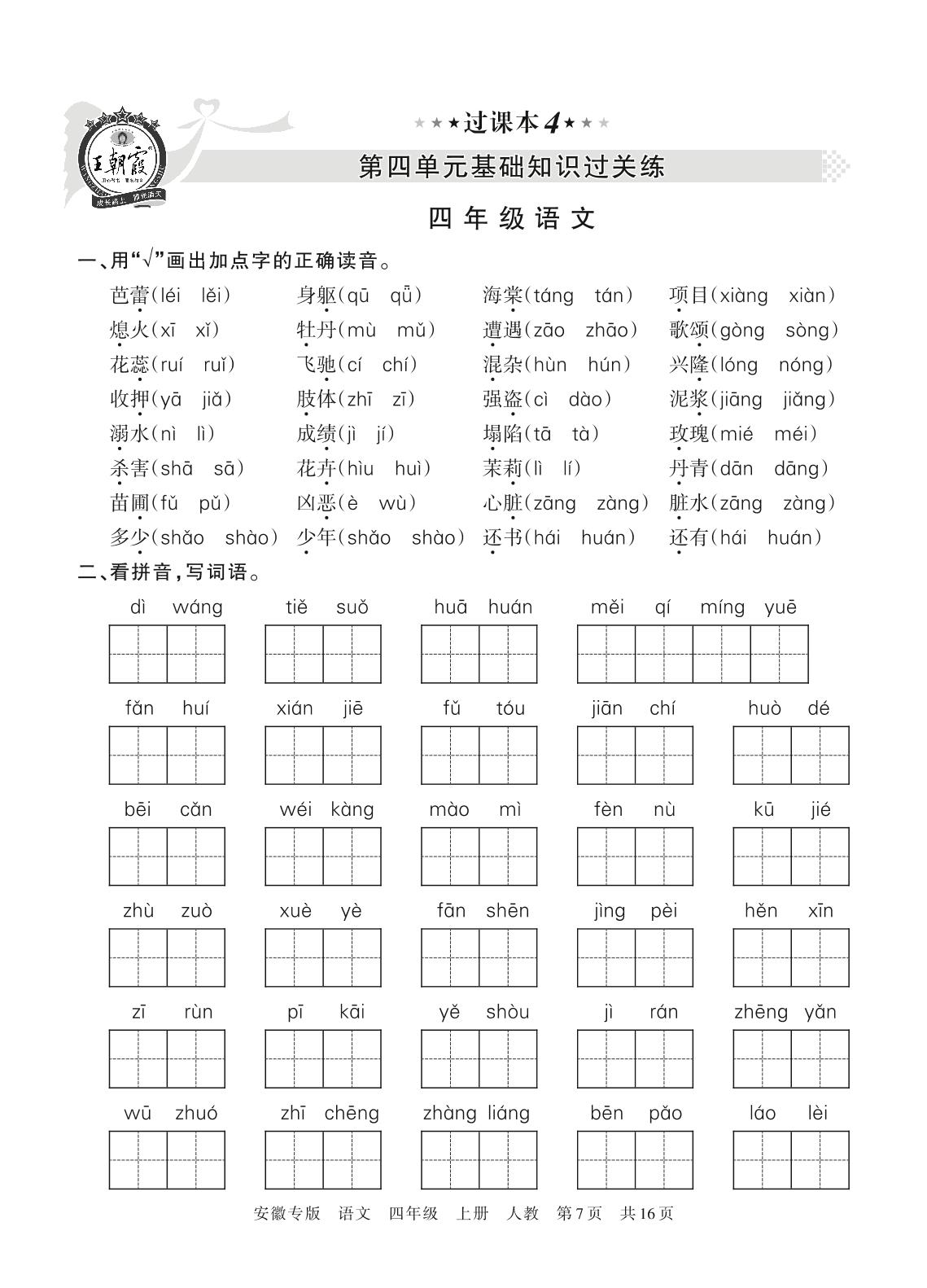 王朝霞期末过课本——第四单元基础知识过关练四年级上册语文(人教版)_R211112105427733【4】