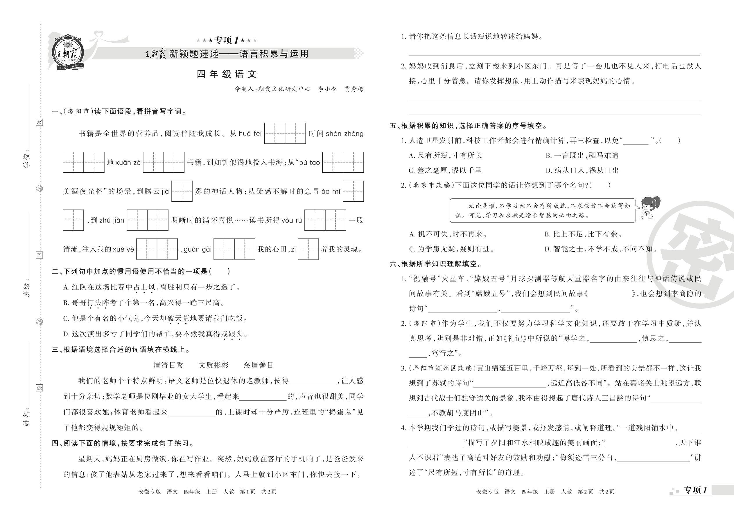 王朝霞期末专项卷——新颖题速递:语言积累与运用四年级上册语文(人教版)_R211112105427031【1】