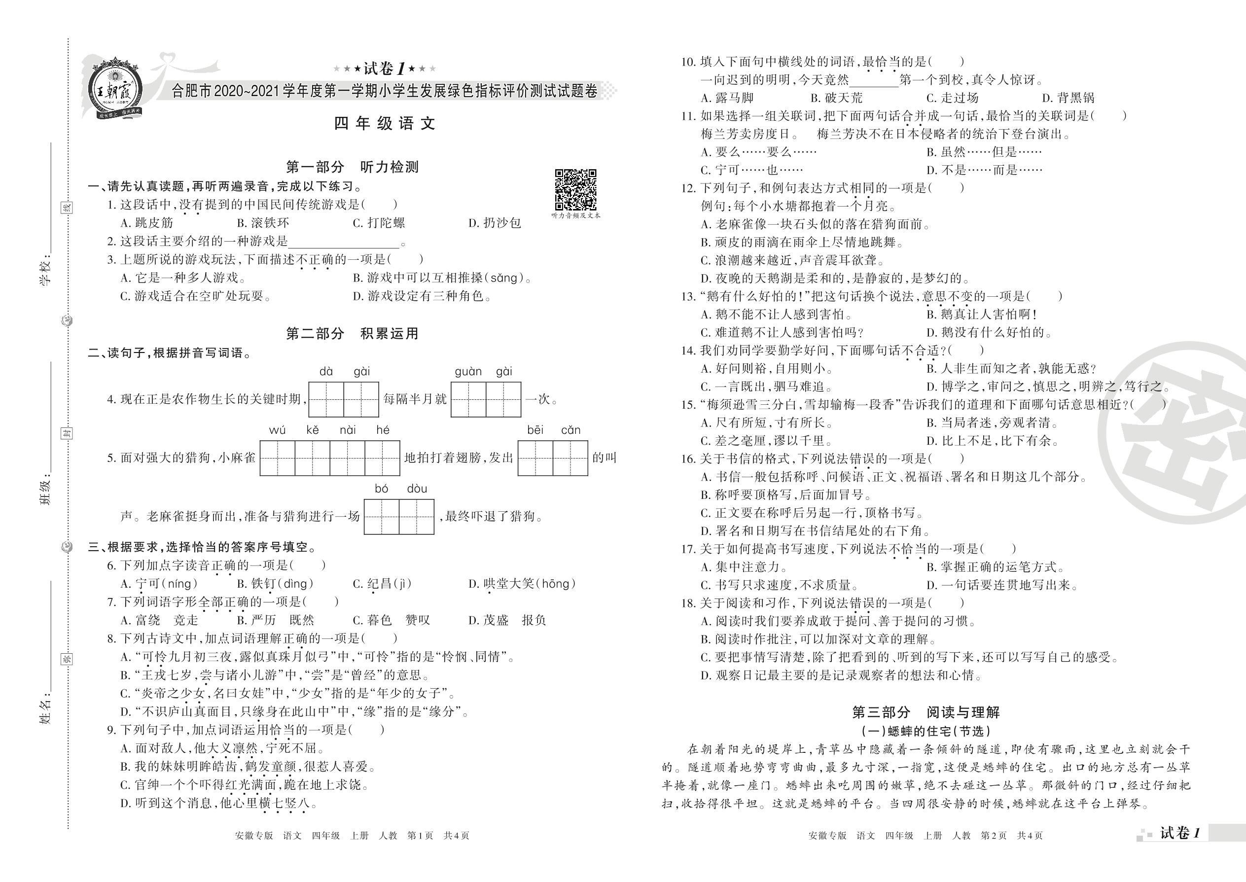 合肥市2020~2021学年度第一学期小学生发展绿色指标评价测试试题卷四年级语文(人教版)【1】