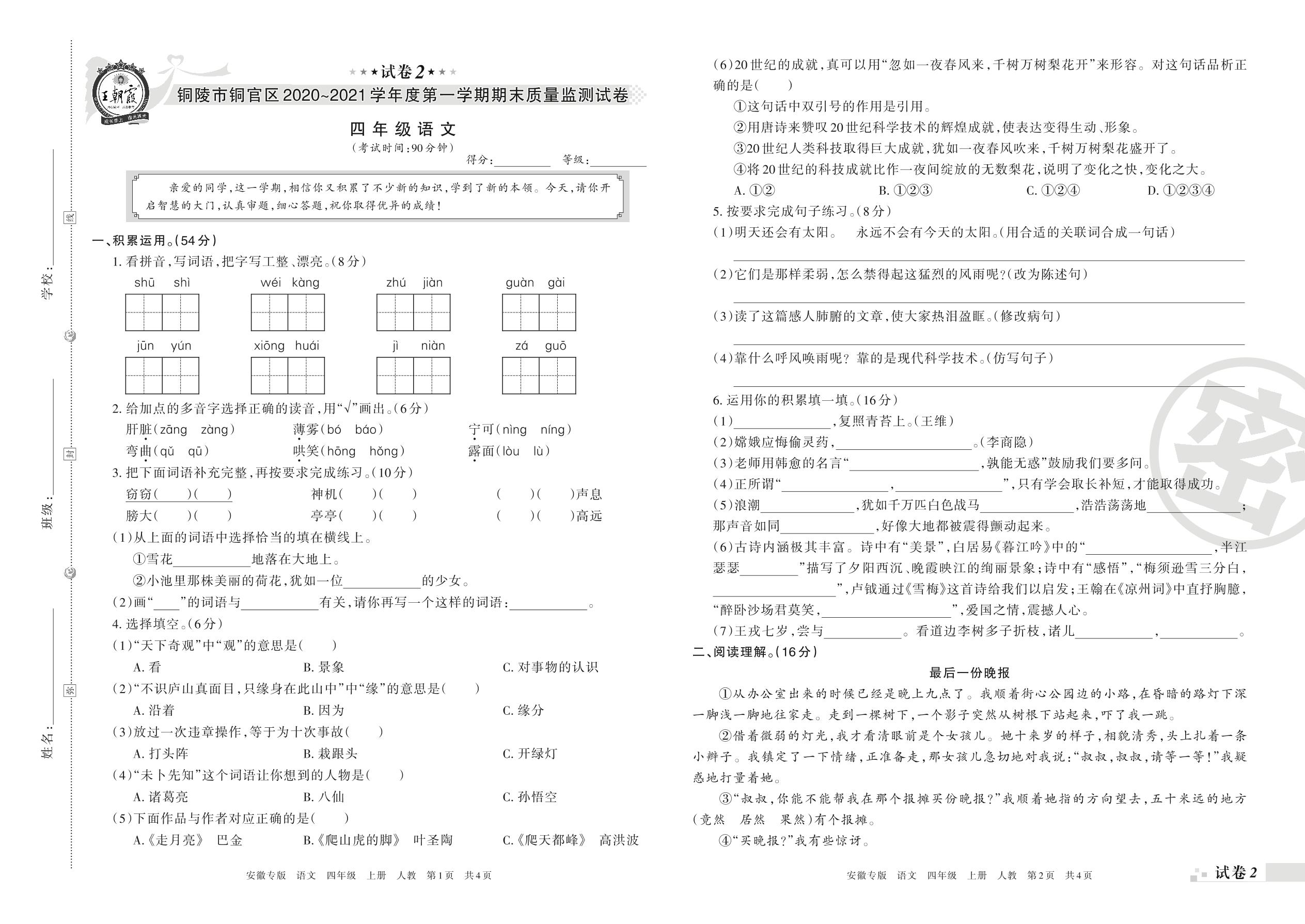 铜陵市铜官区2020~2021学年度第一学期期末质量监测试卷四年级语文(人教版)【2】
