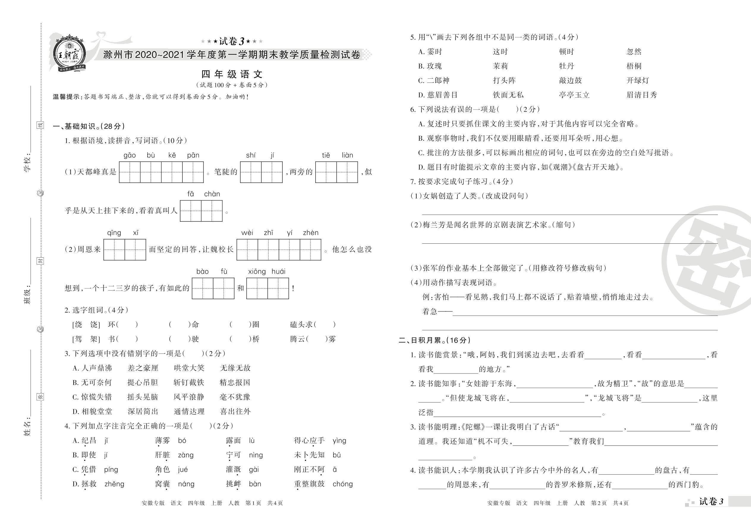 滁州市2020~2021学年度第一学期期末教学质量检测试卷四年级语文(人教版)【3】