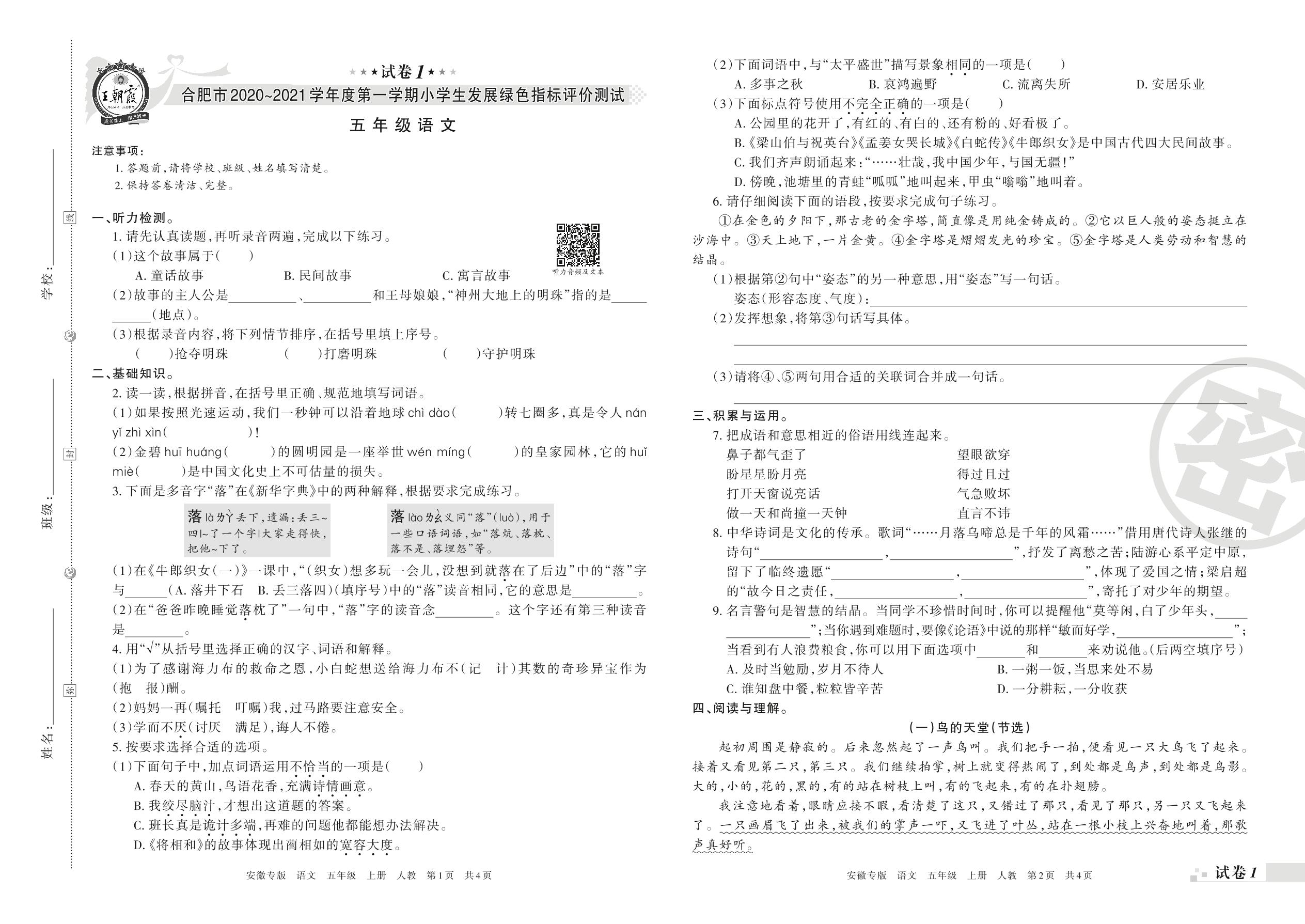 合肥市2020~2021学年度第一学期小学生发展绿色指标评价测试五年级语文(人教版)【1】