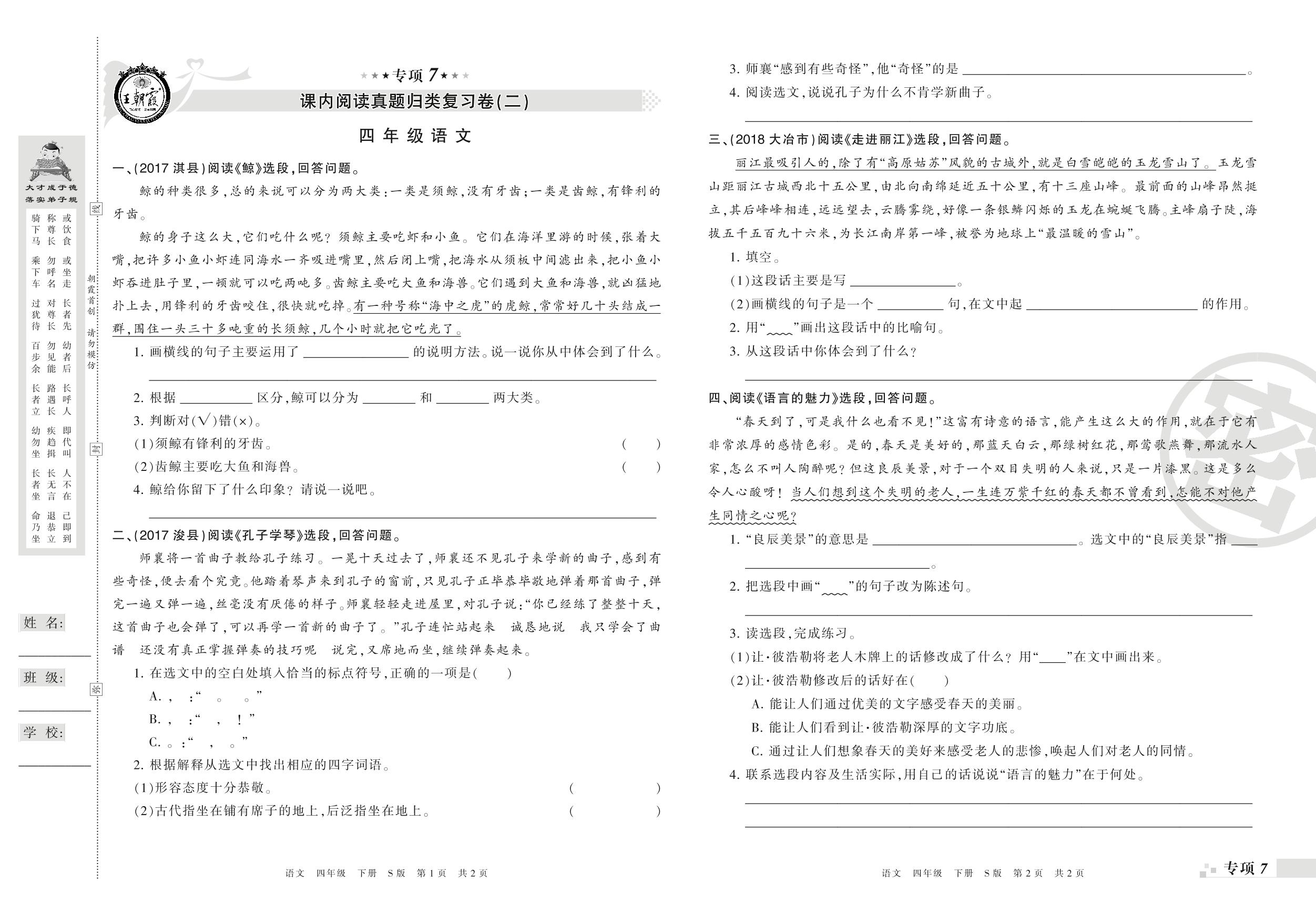 王朝霞期末专项卷——课内阅读、课外阅读与写作真题归类复习四年级下册语文(S版)_R210801202022【0】