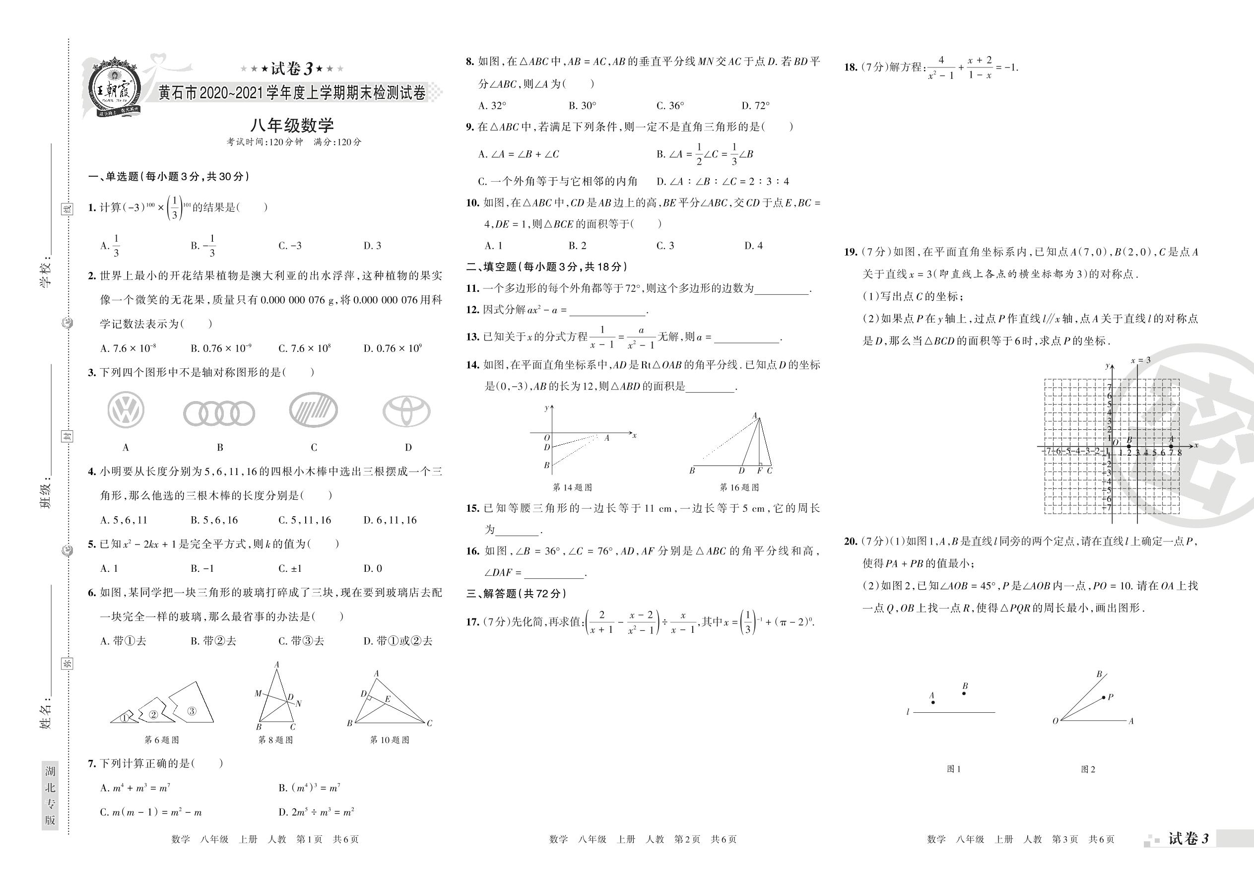 黄石市2020~2021学年度上学期期末检测试卷八年级数学(人教版)【3】