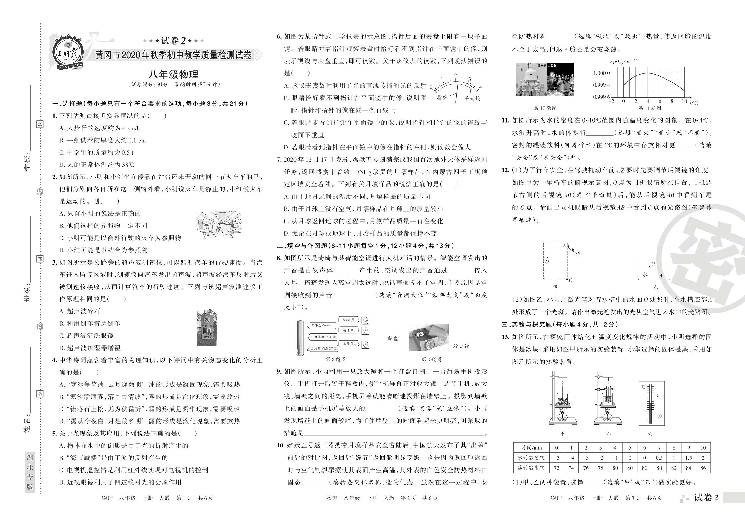黄冈市2020年秋季初中教学质量检测试卷八年级物理(人教版)【2】