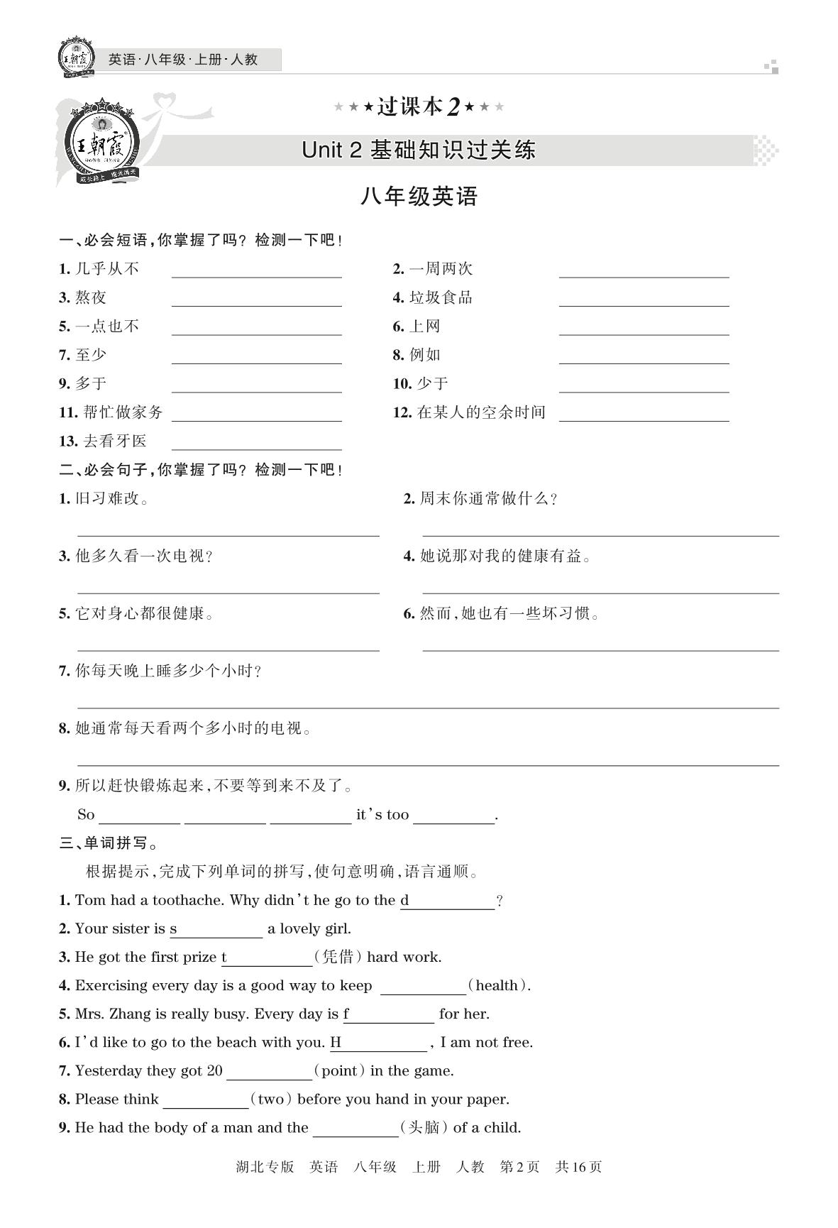 王朝霞期末过课本——Unit 2 基础知识过关练八年级上册英语(人教版)【2】