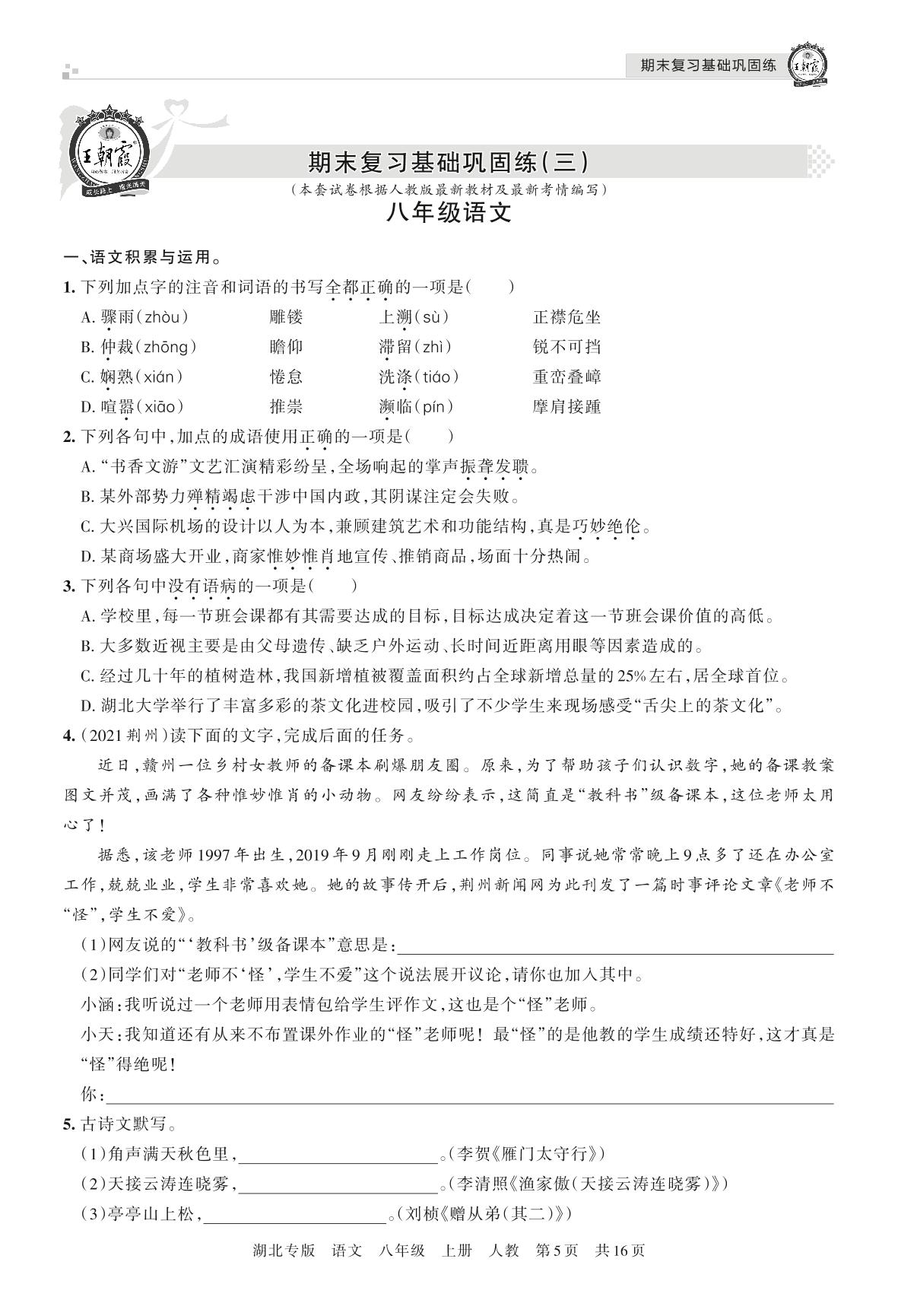 王朝霞期末小卷——期末复习基础巩固练(三)八年级上册语文(人教版)【3】
