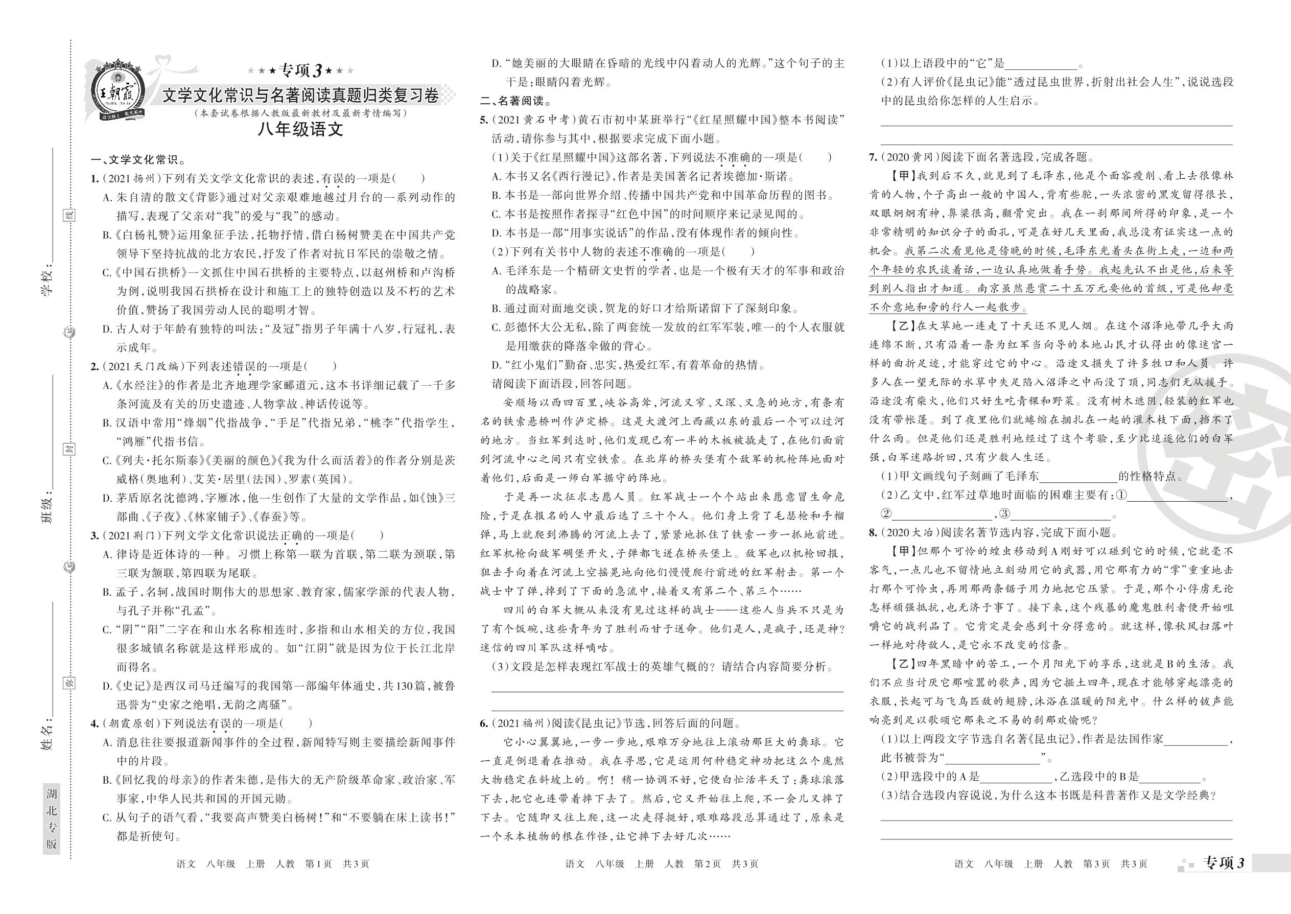 王朝霞期末专项卷——文学文化常识与名著阅读真题归类复习卷八年级上册语文(人教版)【3】