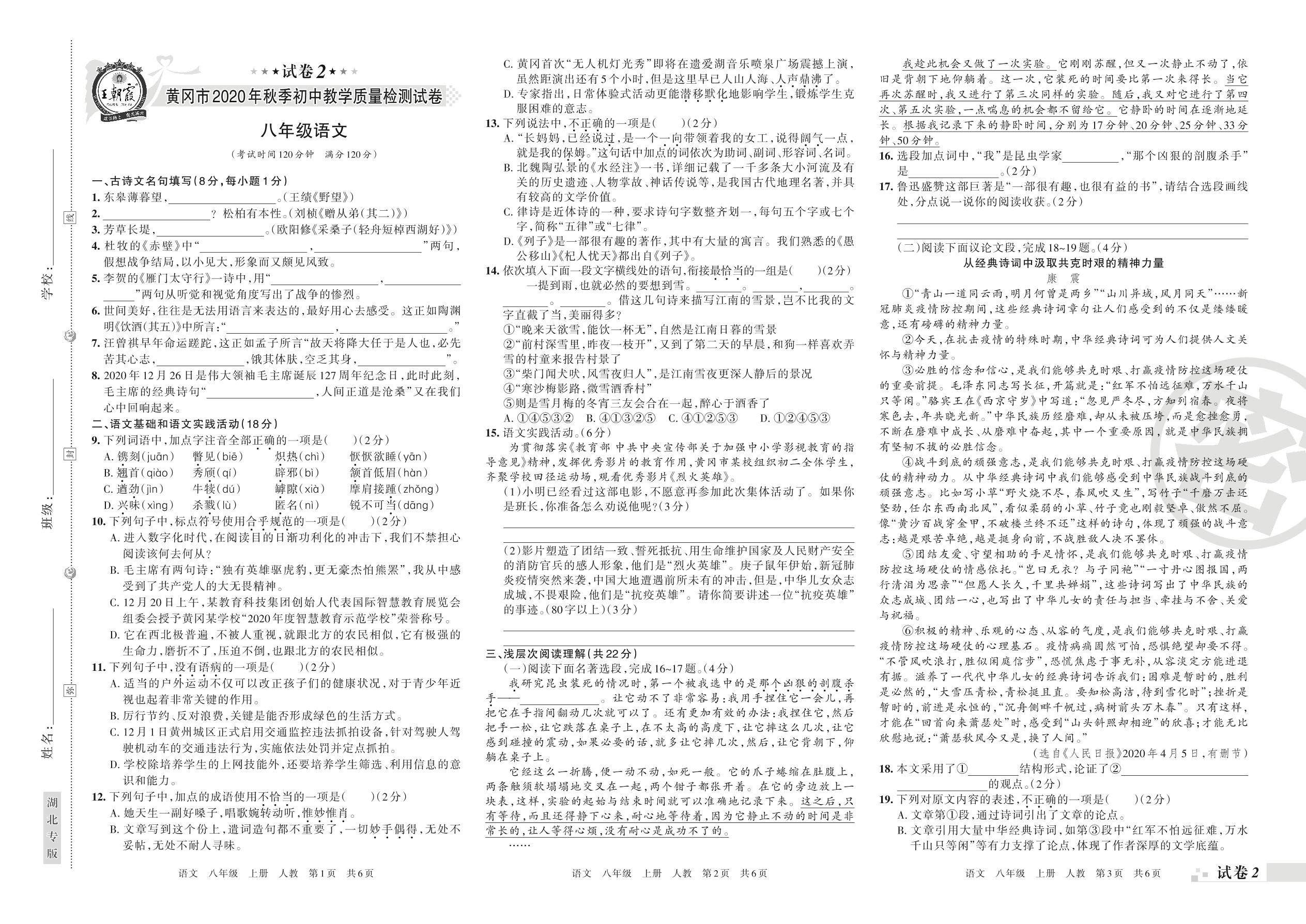黄冈市2020年秋季初中教学质量检测试卷八年级语文(人教版)【2】
