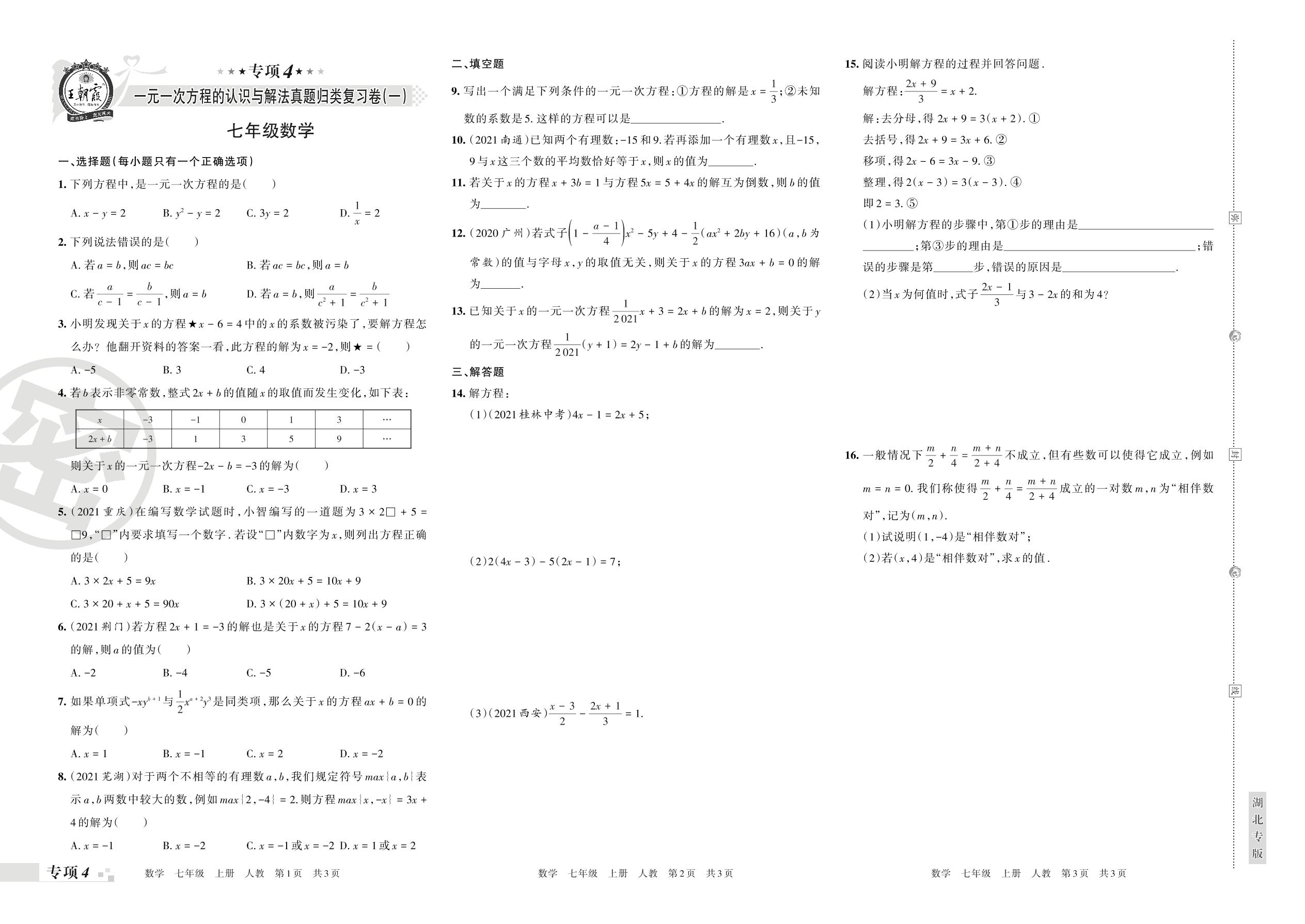王朝霞期末专项卷——一元一次方程的认识与解法真题归类复习卷(一)七年级上册数学(人教版)【4】