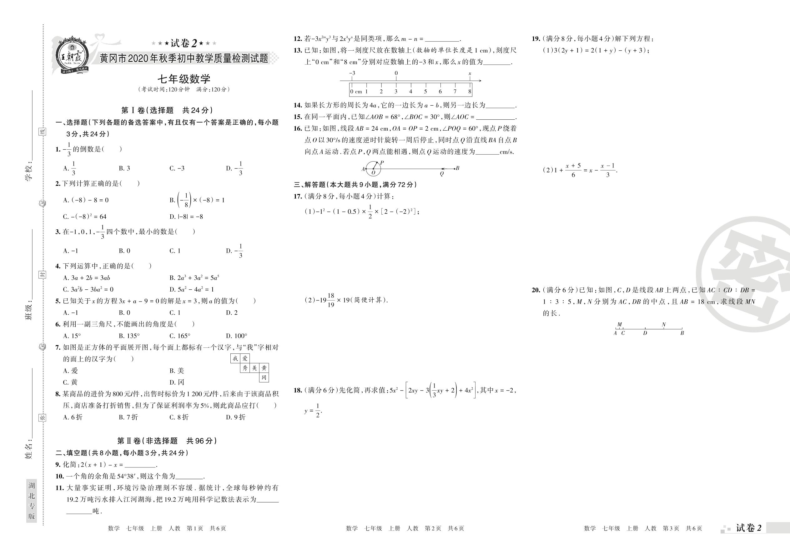 黄冈市2020年秋季初中教学质量检测试题七年级数学(人教版)【2】