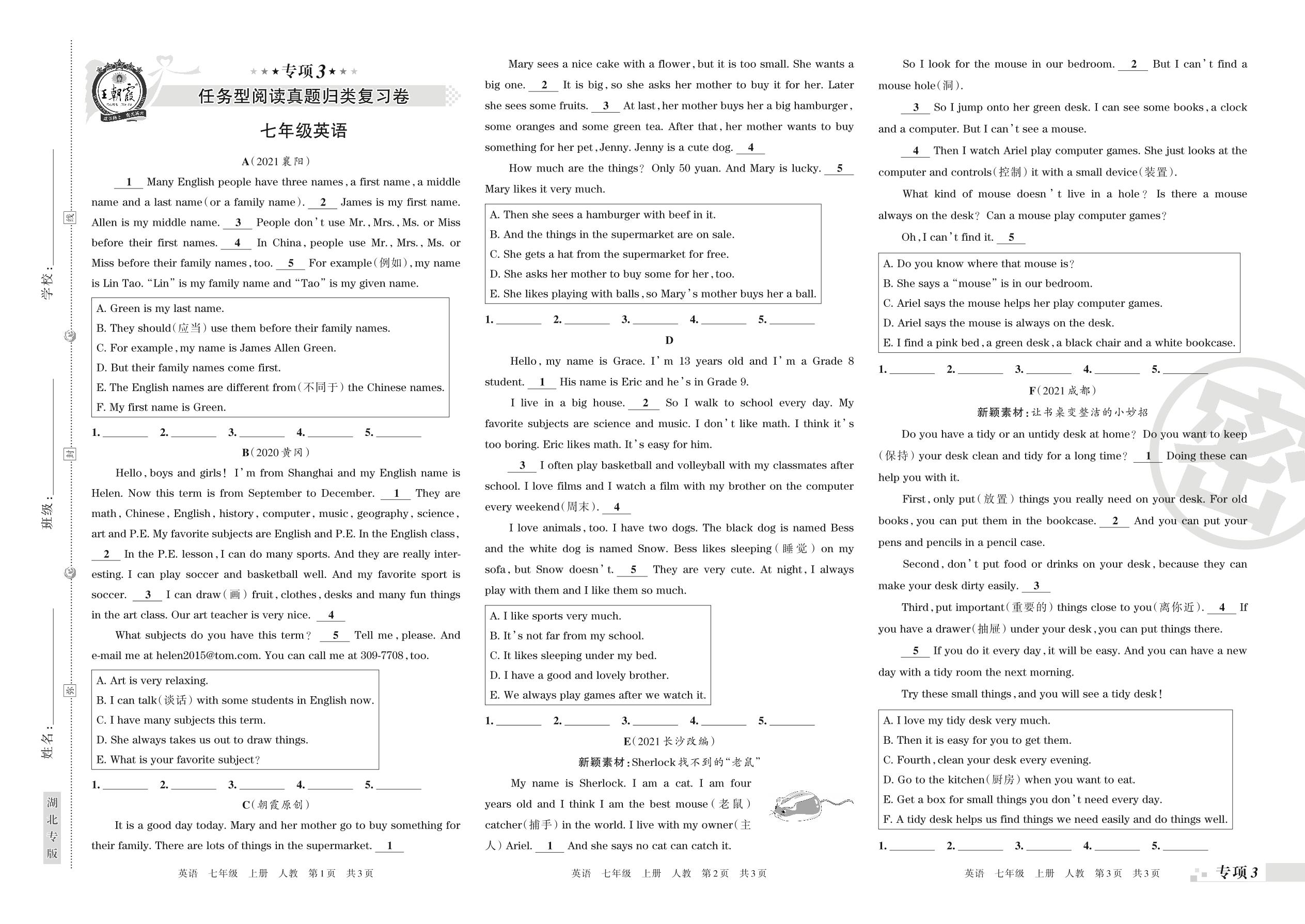王朝霞期末专项卷——任务型阅读真题归类复习卷七年级上册英语(人教版)【3】